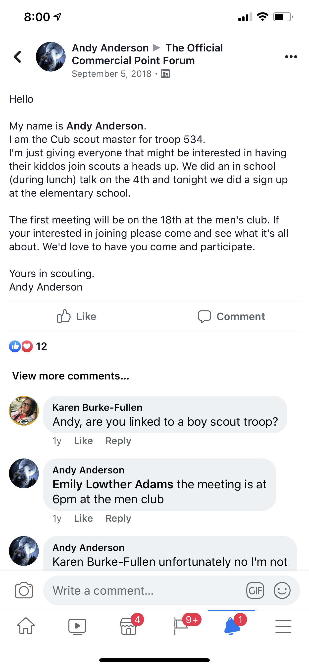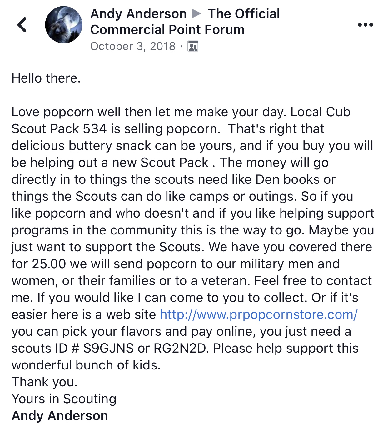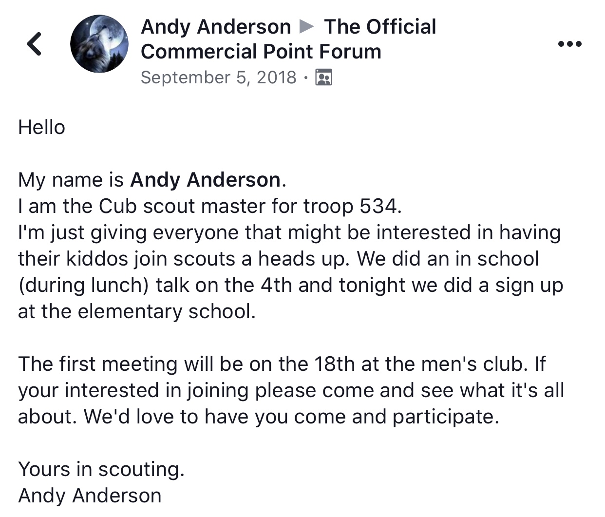 On scoutcander.com a page for cub scouts Andy Anderson is listed as a Cubmaster for the pack. Heres the link: https://www.scoutlander.com/publicsite/unitcontact.aspx?UID=47368