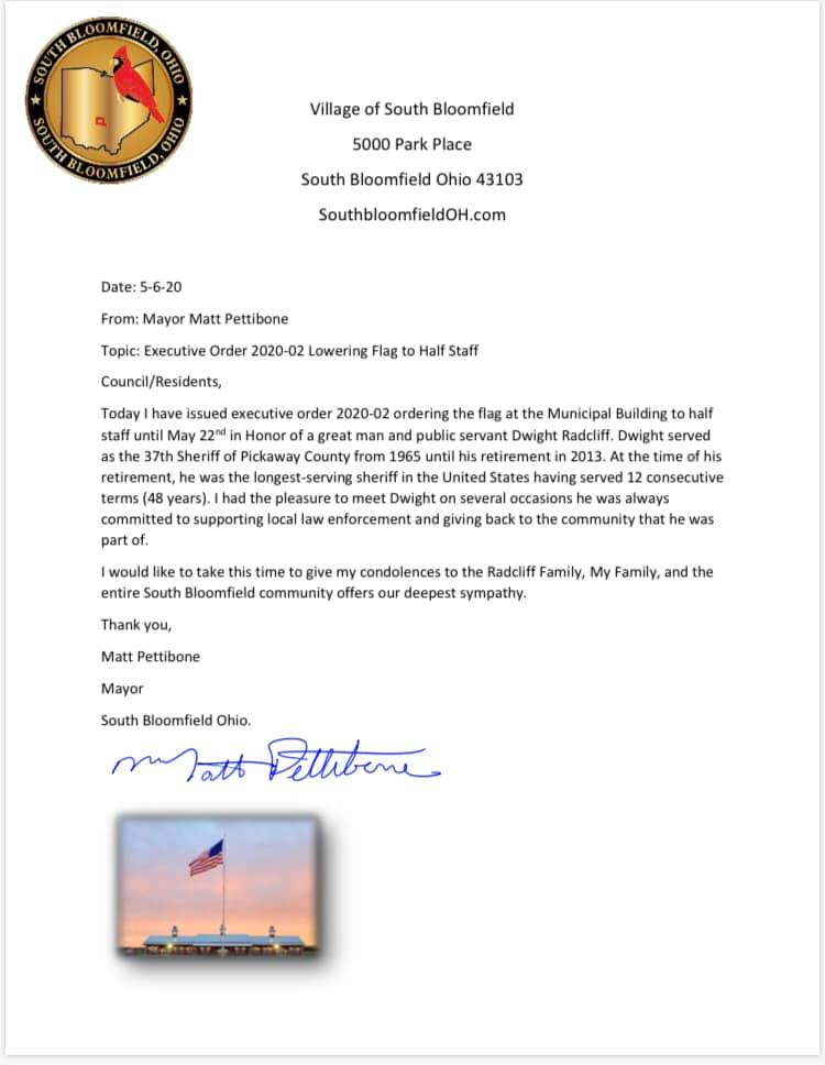 Mayor Matt Pettibone of South Bloomfield has issued an executive order lowering the flags at the municipal building to half staff until May 22, 2020.