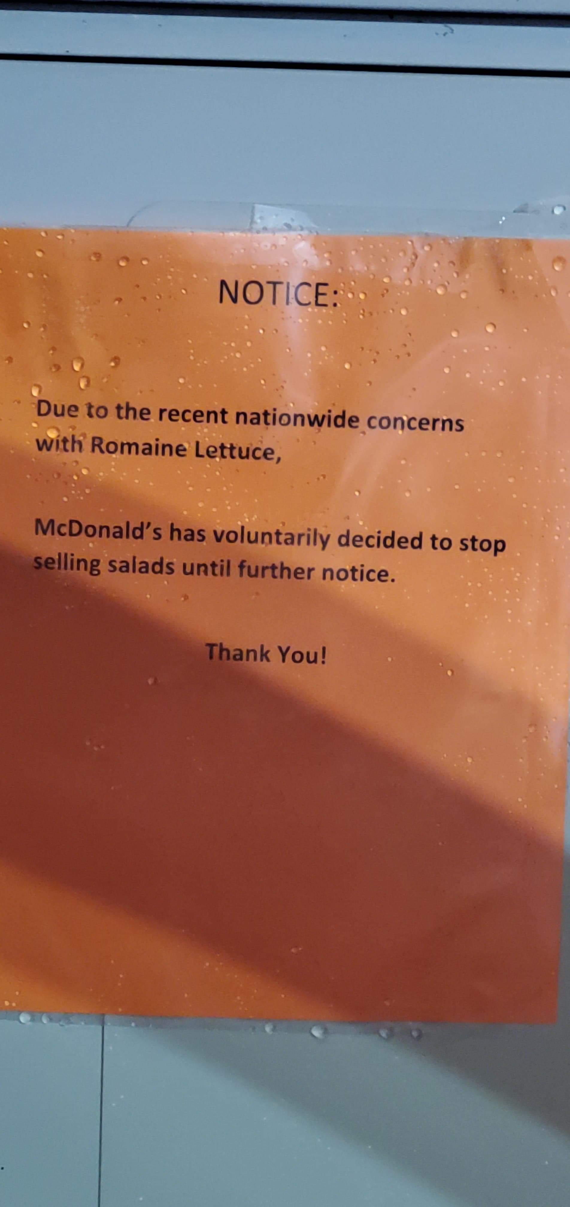 Usa – McDonalds is pulling all Romaine lettuce due to a nationwide scare of salmonella. Today Circleville McDonalds posted a sign of the removal.
