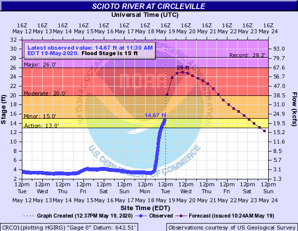 CIRCLEVILLE – Water will continue to rise until around Noon on Wednesday according to the National Weather Hydronic Prediction graph.