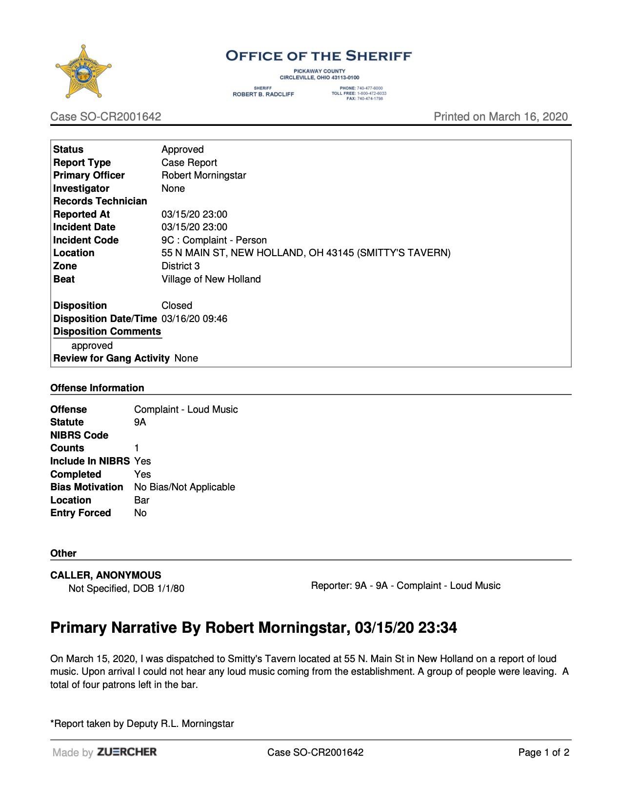 NEW HOLLAND – A local bar owner thinks that the rule doesn’t apply to her when she decided to not close down as mandated by Dewine for all bars to close at 9 pm effective immediately. This judgement came from Dewine to limit the social interactions that are deemed non-necessary due to the spread of Coronavirus or COVID-19 Pickaway Sheriff was called to the location for a noise violation and because they were open beyond the 9 pm mandated time it was 11:34 according to the report. When officer Morningstar arrived at the location the noise had been turned down and according to the report four patrons were inside the bar.