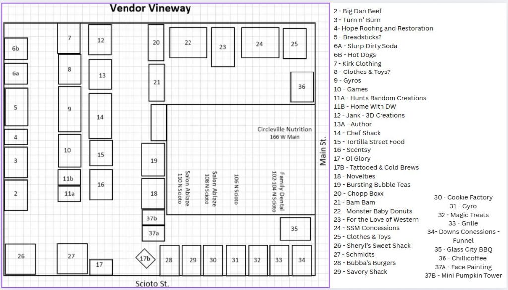 The Vendor Vineway, located beside Circleville Nutrition (166 W. Main St.), includes popular names such as Big Dan Beef, Schmidts, Bubba’s Burgers, Cookie Factory, Glass City BBQ, Tattooed & Cold Brews, Bursting Bubble Teas, and Monster Baby Donuts. Visitors can also find handmade goods, apparel, jewelry, games, and more — all in one easy-to-explore section.