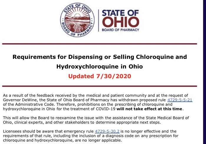 “Ohio Pharmacy Board has reversed their decision on hydroxychloroquine, and I believe that was the right thing to do. I believe their process in arriving at the decision to ban hydroxychloroquine for treating #COVID19 patients was fundamentally flawed, said Dewine.