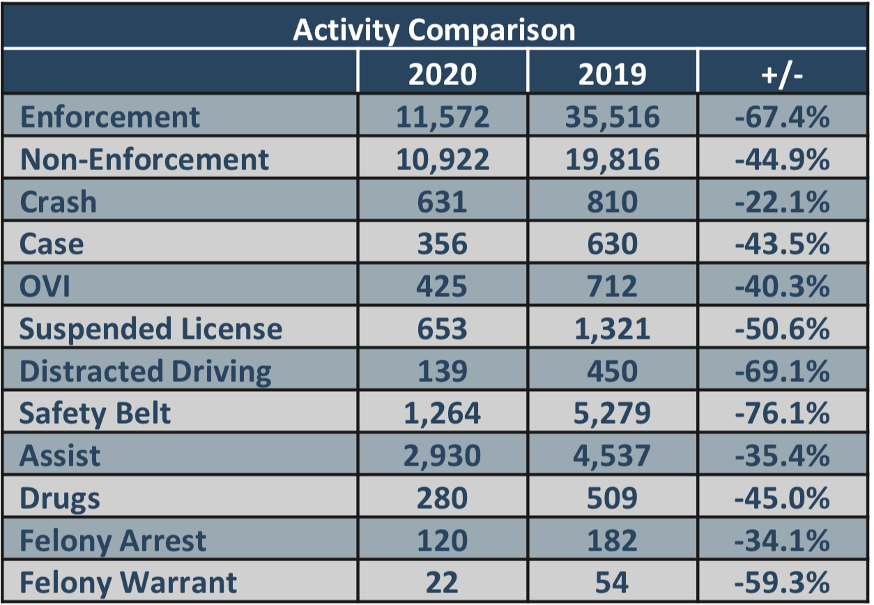 Troopers made 425 arrests for impaired driving and 280 for drug-related charges. The Patrol responded to 631 crashes and made more than 22,494 traffic contacts in total, which included providing assistance to more than 2,900 motorists.
