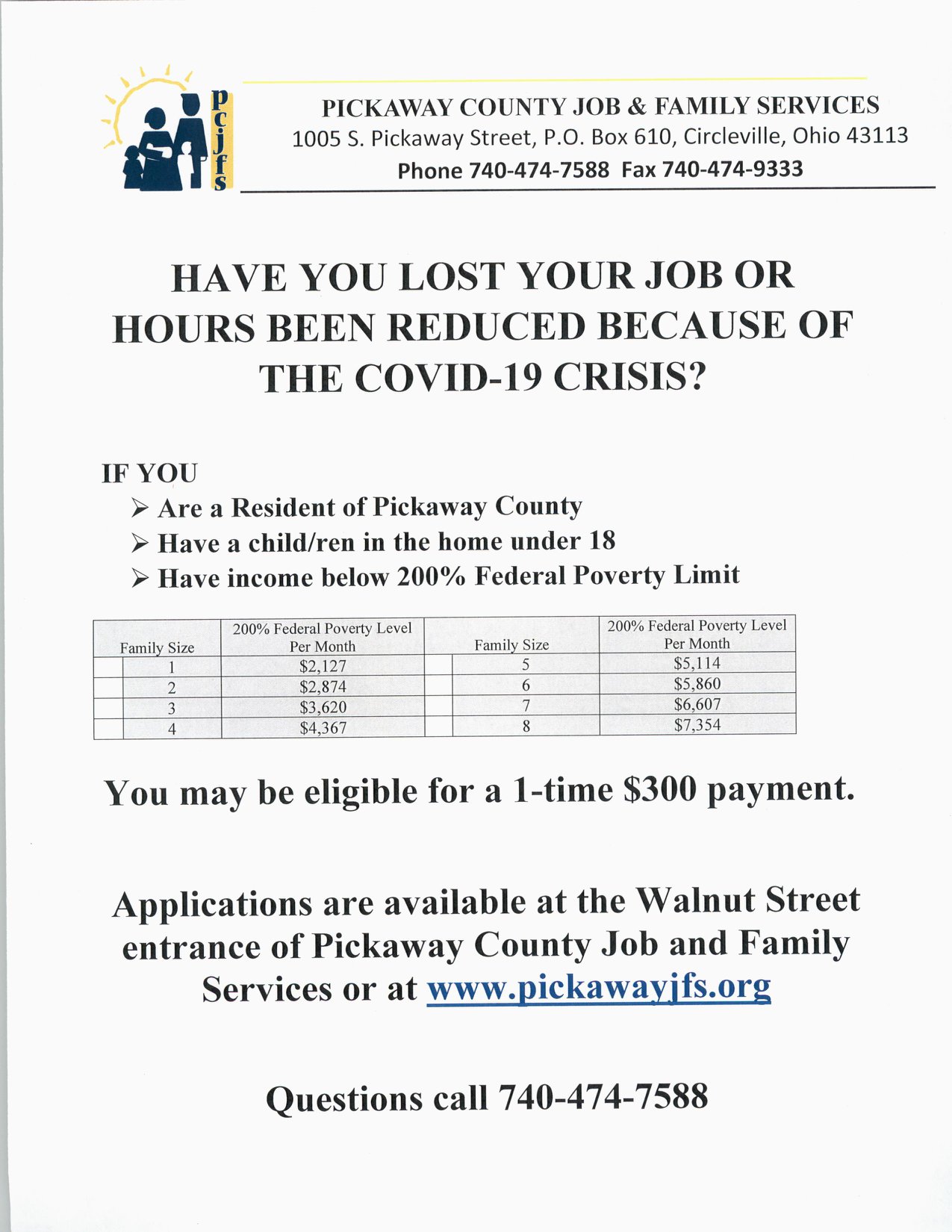 PICKAWAY – Ohio Means Jobs Pickaway County is offering a 300 dollar payment for people who qualify that have been affected by job loss or reduction in hours due to COVID-19 crisis.