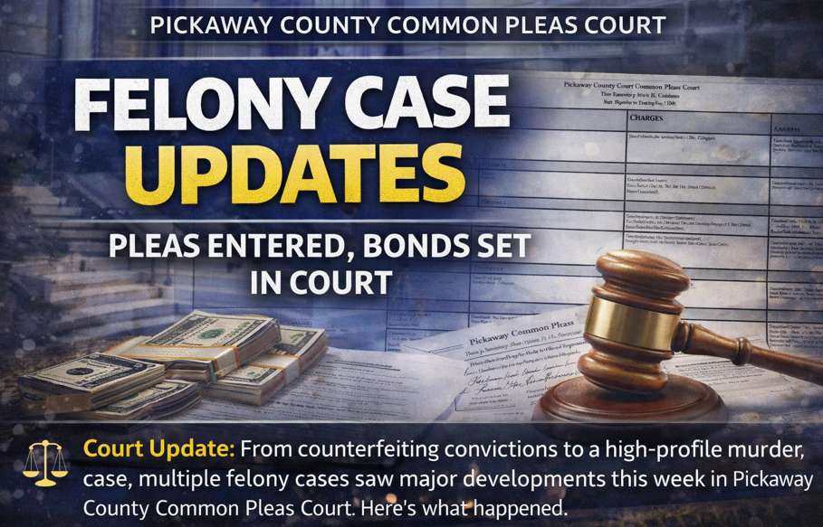 CIRCLEVILLE, OH — Several felony cases moved forward Wednesday in Pickaway County Common Pleas Court as Judge Matthew H. Chafin accepted pleas, set future court dates, and ordered bond conditions in matters ranging from counterfeiting and theft to violent crimes.