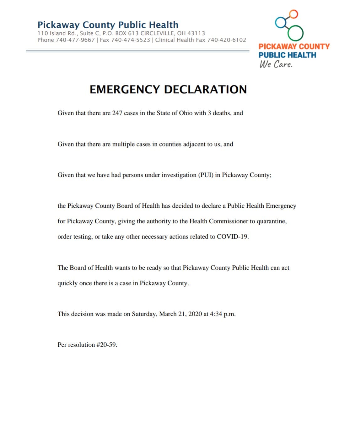 The Pickaway County Health Board made the emergency declaration because it gives the board the ability to quarantine, order testing and take other actions not allowed by law unless the board gives the order.