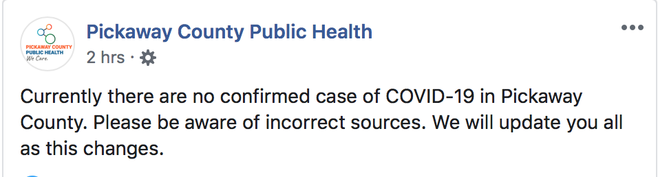 PICKAWAY – Online posts keep getting shared out there adding to some of the panic in the area and Public Health has posted something publicly to let Pickaway County individuals know that there are no current cases of COVID-19 in Pickaway County.