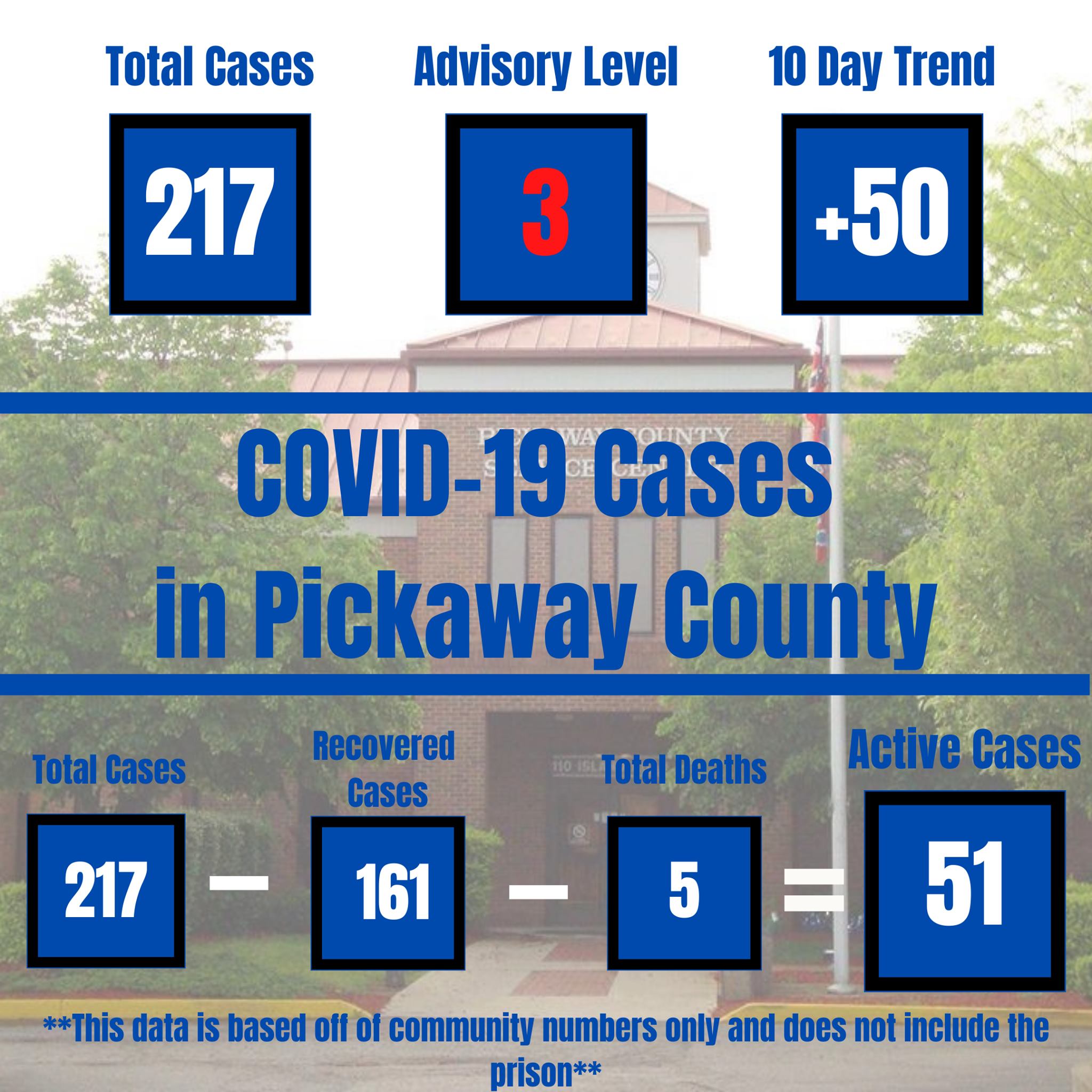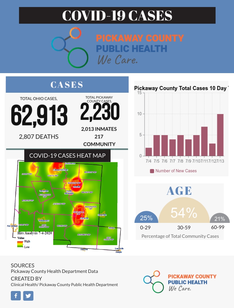 As of 3:00 p.m. today, Monday, July 13, 2020 there are a total of COVID-19 62,913 cases in Ohio and 2,807 deaths. Currently there are 2,230 confirmed positive COVID-19 cases in Pickaway County, 2,013 being inmates, leaving 217 local residents who have tested positive.There are 51 active local resident cases with 2 hospitalized. There are a total of 42 deaths, 37 being inmates and 5 community deaths.