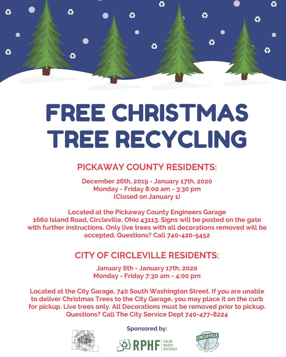 For Circleville residents from January 6th to January 17th you can drop off live trees at 740 South Washington street. Circleville residents have the option of curbside pick up also during this time.