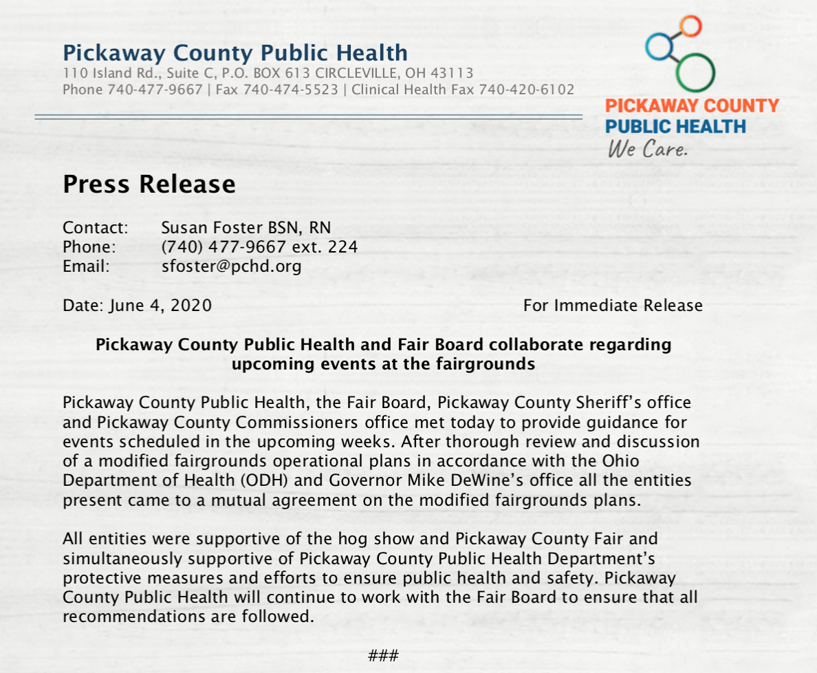 More information will be pushed out by the fair board during the Monday June 8th meeting, outlines to orders and requirements will be available on the website at:http://www.pickawaycountyfair.org/?fbclid=IwAR0zNC1BBKIVkeHEaAktjzl038Ae89xvLRk37tsrMVq-RgnCtSS-bzqyZSs