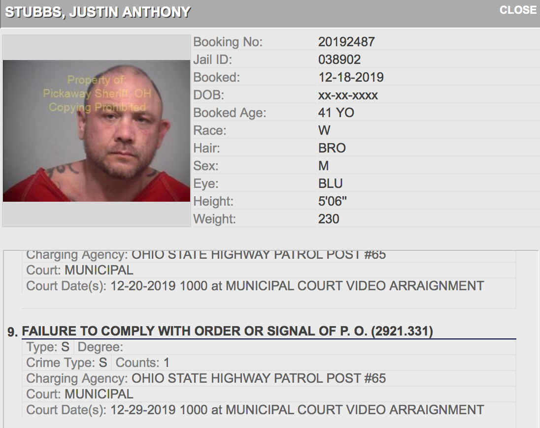 Stubbs who was arrested at the scene was charged with, possession of drugs 1,11, Open container, Illegal use or possession of marijuana drug paraphernalia, OVI, Operating a motor vehicle without a valid drivers license, No seat belt, Driving in marked lanes, no tail lights, and Failure to comply with order or signal of P.O.