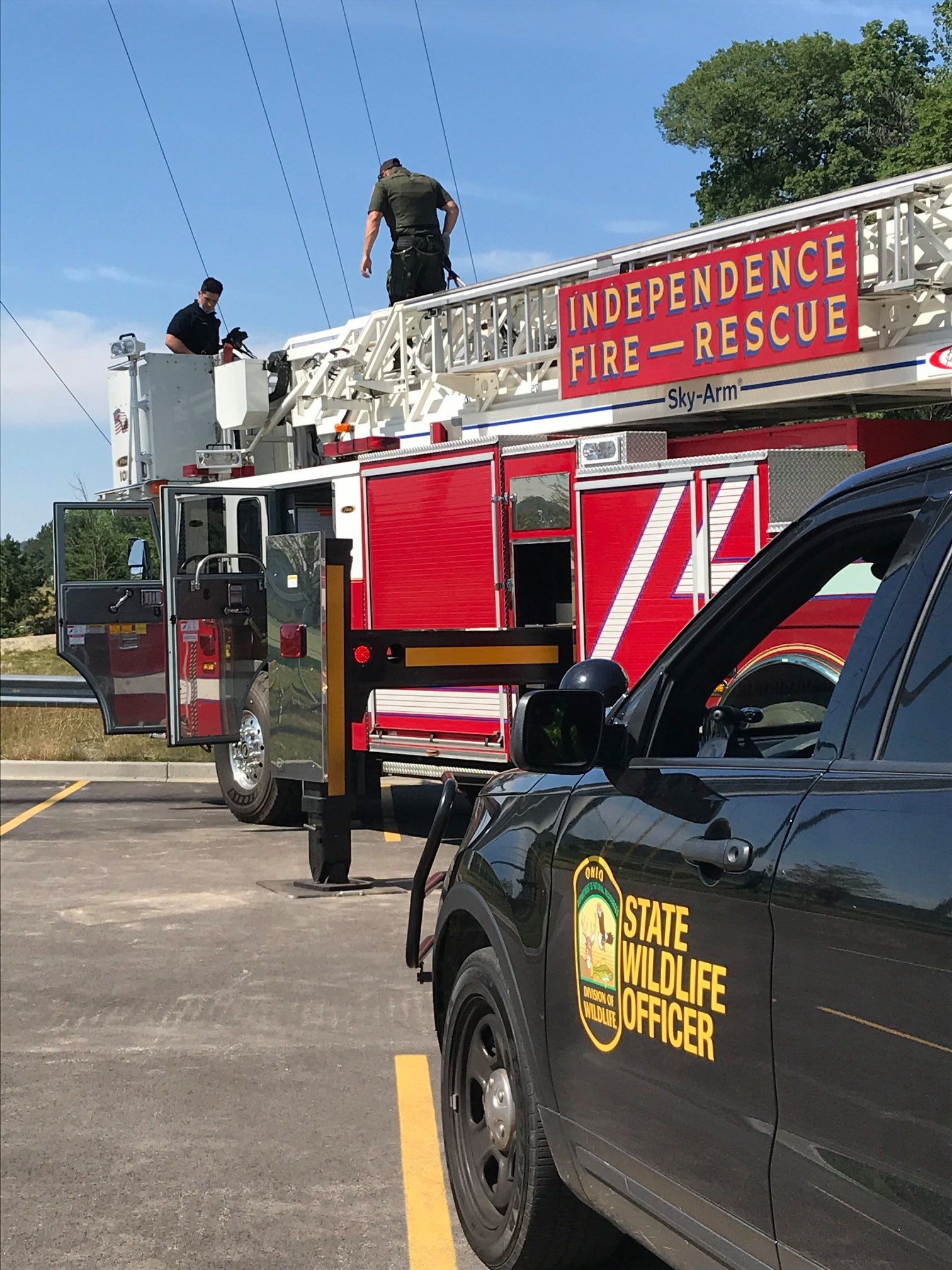 Thats when wildlife authorities received the call and got on scene they realized that they would need more help and contacted Independence, OH Fire & Police departments who brought a ladder truck and manpower to the scene.