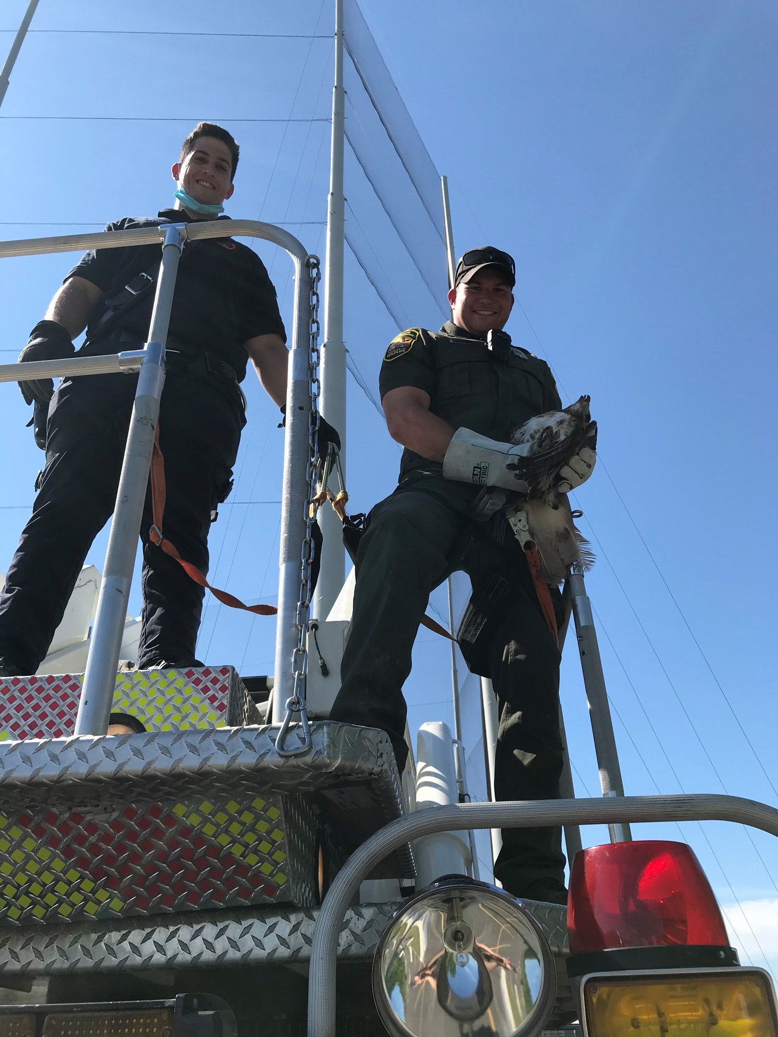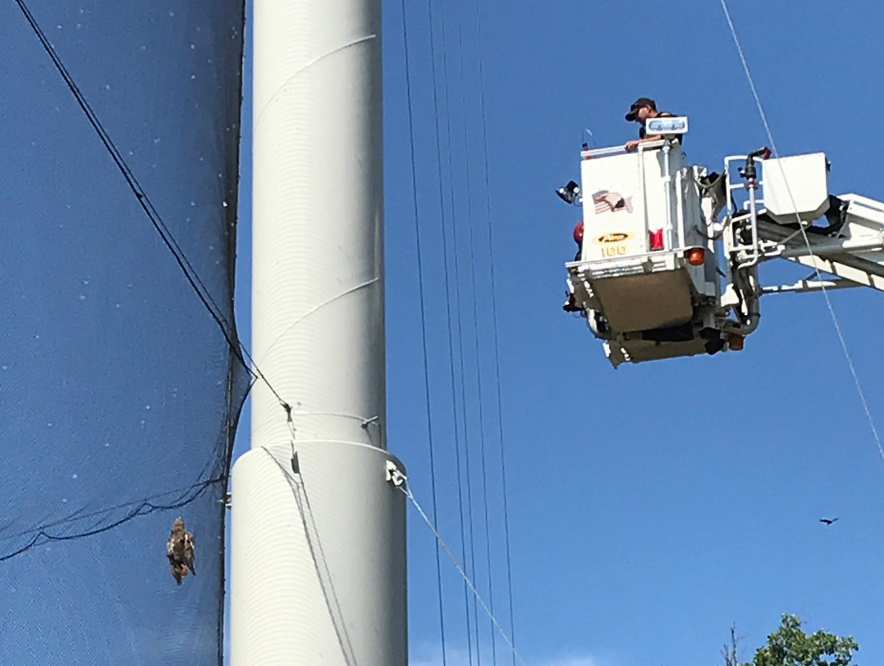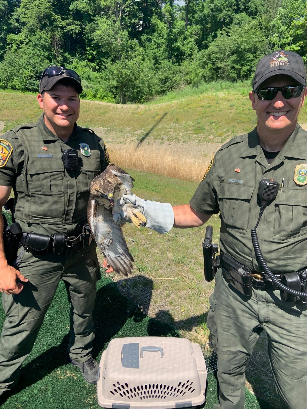 OHIO – Two red-tailed hawks were saved by first responders and Ohio Division of Wildlife officers this week in a combined effort when they were caught in a net hundreds of feet above the ground.