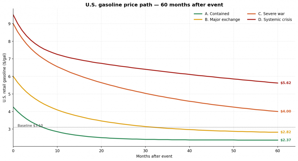 These estimates assume functioning refining and distribution systems. In a conflict scenario, additional factors could push prices even higher: