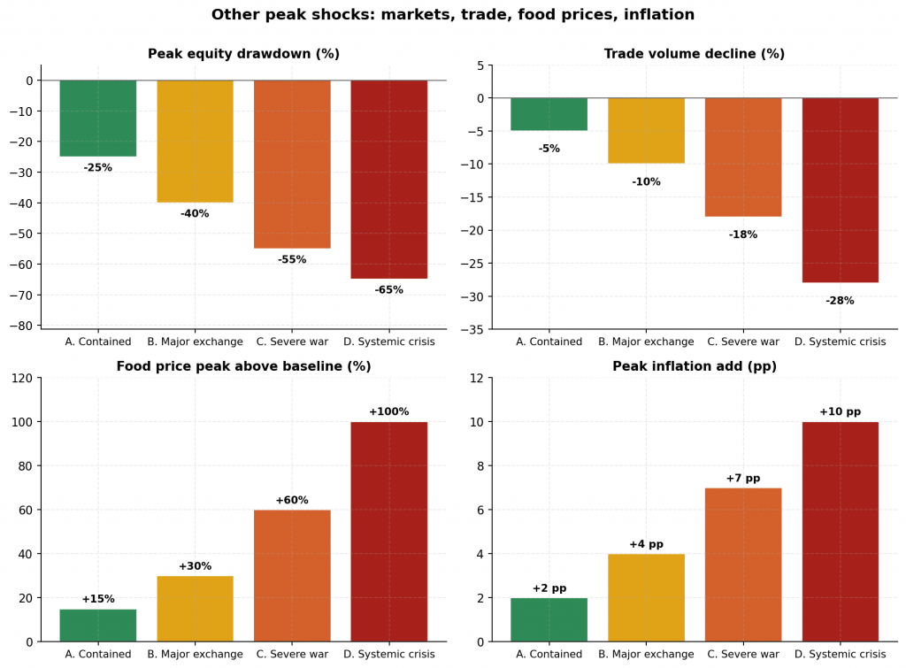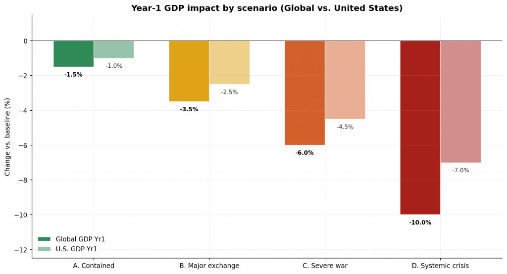 Immediate effects would include equity market collapse, a flight to safe-haven assets, and liquidity contraction. Insurance markets would face systemic stress due to war exclusions and uncertainty.