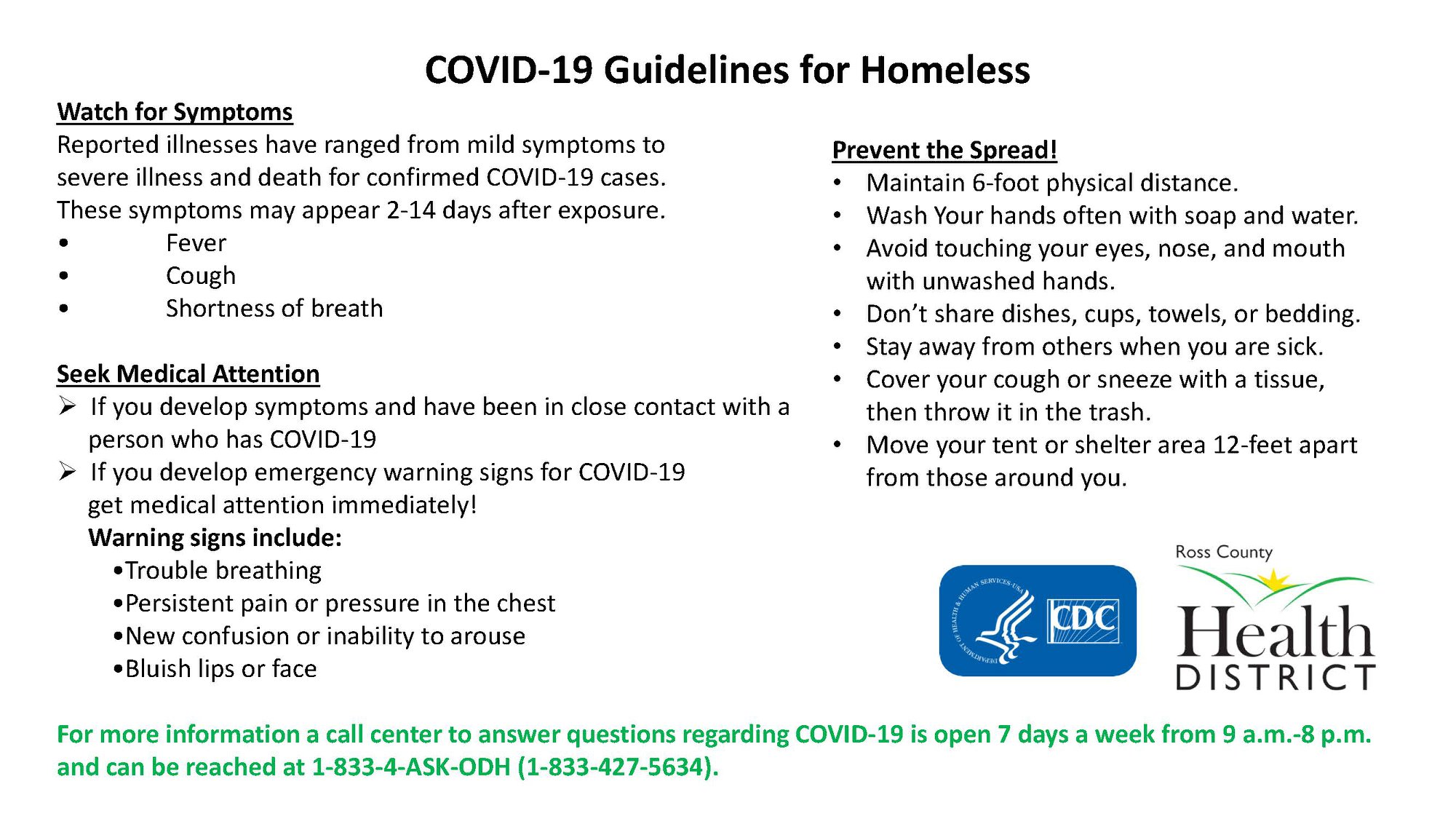 Ross County has released information for the homeless during this time that information is below.