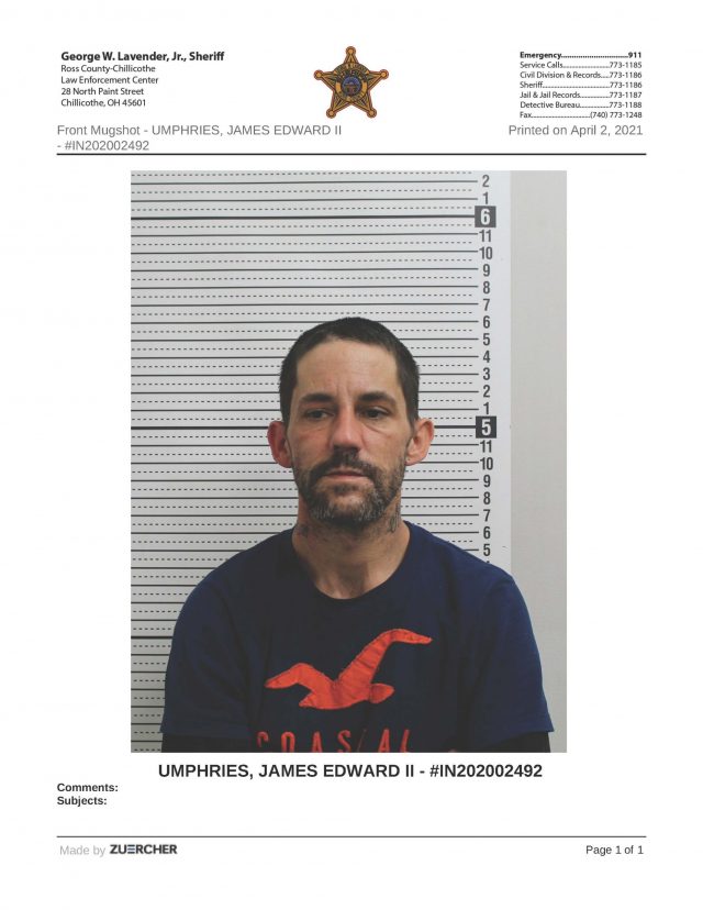 According to the sheriff At approximately 2:15pm on April 2 Mr. James E. Umphries II walked away from his work detail on the east side of Chillicothe. Mr. Umphries is currently serving a sentence on misdemeanor charges out of the Chillicothe Municipal Court. He was last seen wearing blue denim pants, blue jacket, brown shirt and brown boots. Mr. Umphries is a white male with brown hair, 5’6″ tall and approximately 160lbs. Please refer to mugshot attached.