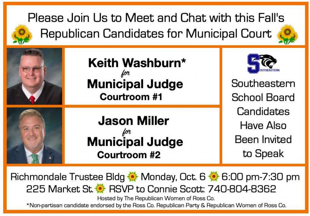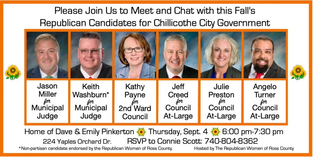 Chillicothe and Ross County — The Ross County Republicans have been hosting meet-and-greets (like their Democratic Party opponents) to introduce candidates to constituents for the fall election. A large gathering was in the Second Ward of Chillicothe, with six candidates appearing.