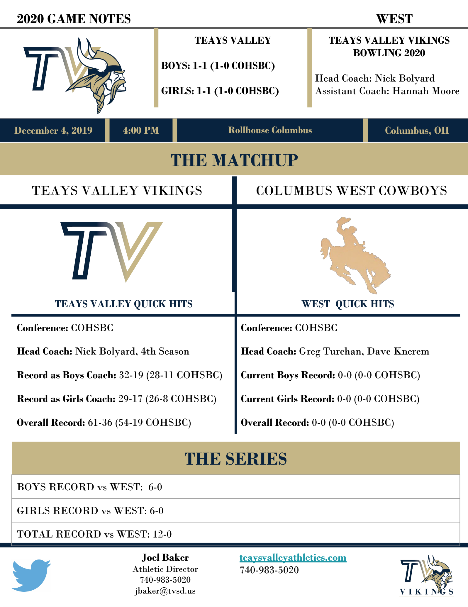 PICKAWAY – The Teays Valley Bowling team defeated Columbus West on Wednesday at Game of Western. The Boys defeated West 2102-1228. The Vikings were led by Jacob Thompson, who shot a 409 series. With the win, the boys move to 2-1 (2-0 COHSBC) on the season. The boys will be in action again on Saturday, December 7 at the Holiday Baker Marathon at the Columbus Square Bowling Palace.