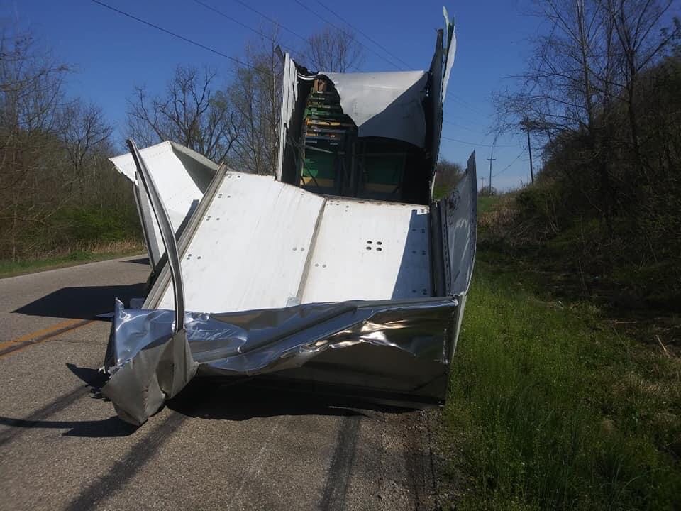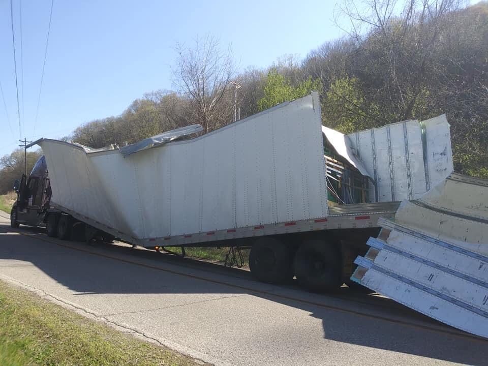 It took hours for the truck to be completely removed from the road. The truck driver was carrying pallets inside the trailer. The trailer was a total loss.