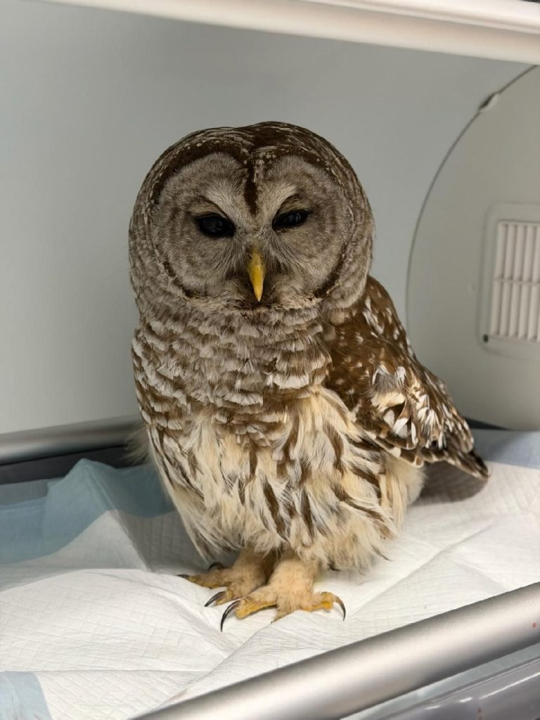 The rescued owl is a barred owl (Strix varia), a species known for its distinctive “Who cooks for you?” call and large brown eyes. Barred owls are common across Ohio and play an important role in controlling rodents and insects. Adults stand 18 to 22 inches tall, with a wingspan of three and a half to four feet, and they often nest in tree cavities or old nests of other birds.