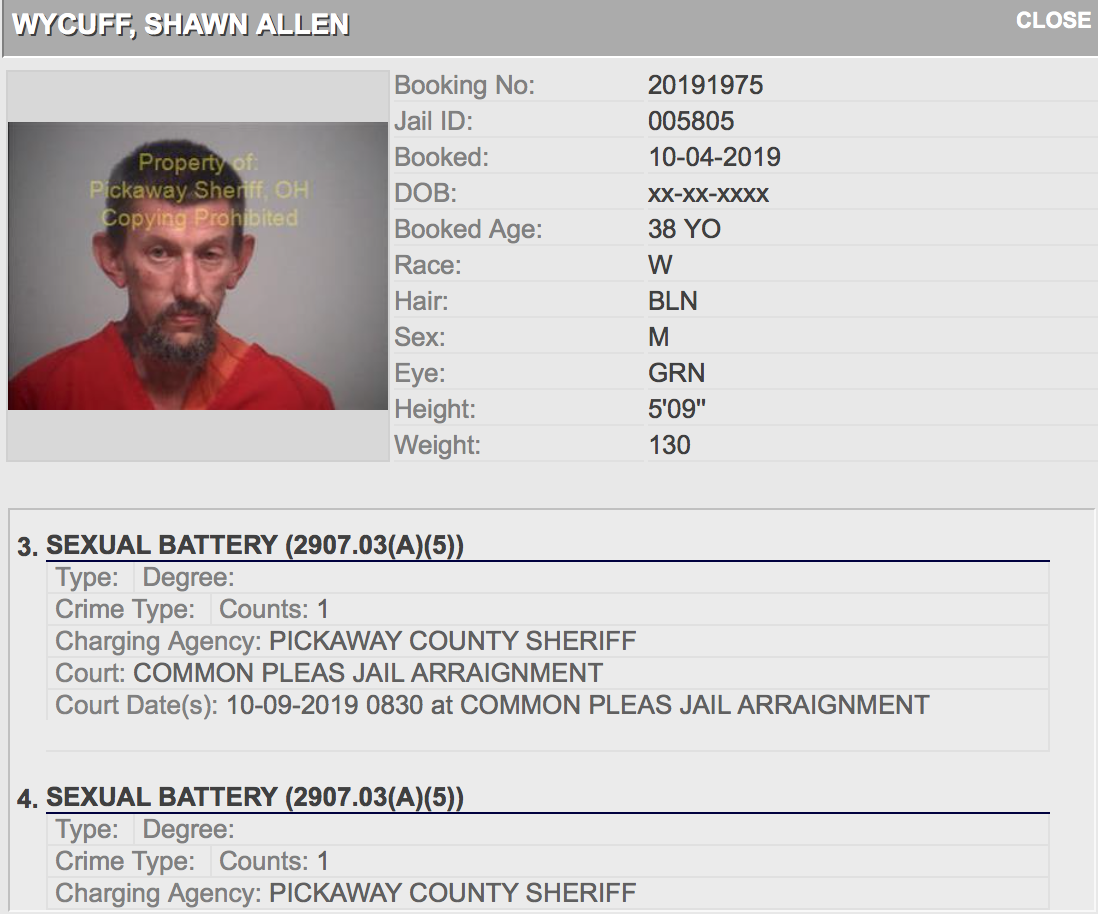 Fast forward to October 4, 2019 Wycuff was picked up for probation raid/drug raid by Circleville Police, Circleville Probation and US Marshals. Wycuff, now 38 had been charged again but for more serious charges. Two Counts of Rape, Two Counts of Sexual Battery, Two Counts of gross sexual imposition, and one count of probation violation, all charges are much more serious than the charge in September he was charged with, plus Wycuff was on one year of intensive supervision probation.