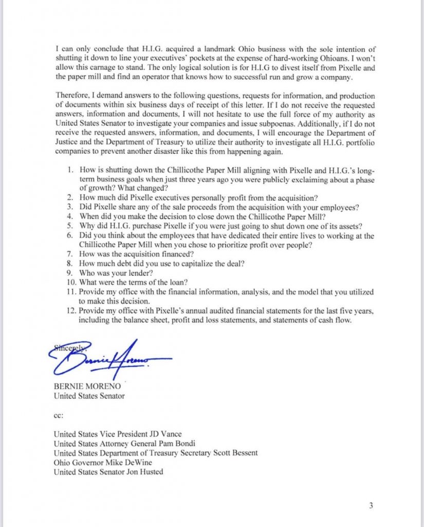 CHILLICOTHE, OH – U.S. Senate candidate Bernie Moreno is demanding answers after the sudden closure of the historic Pixelle paper mill in Chillicothe left nearly 1,000 workers without jobs. In a sharply worded letter sent Thursday to H.I.G. Capital executives, Moreno condemned the decision as “corporate greed” and vowed to pursue a full investigation unless the company provides a detailed explanation.