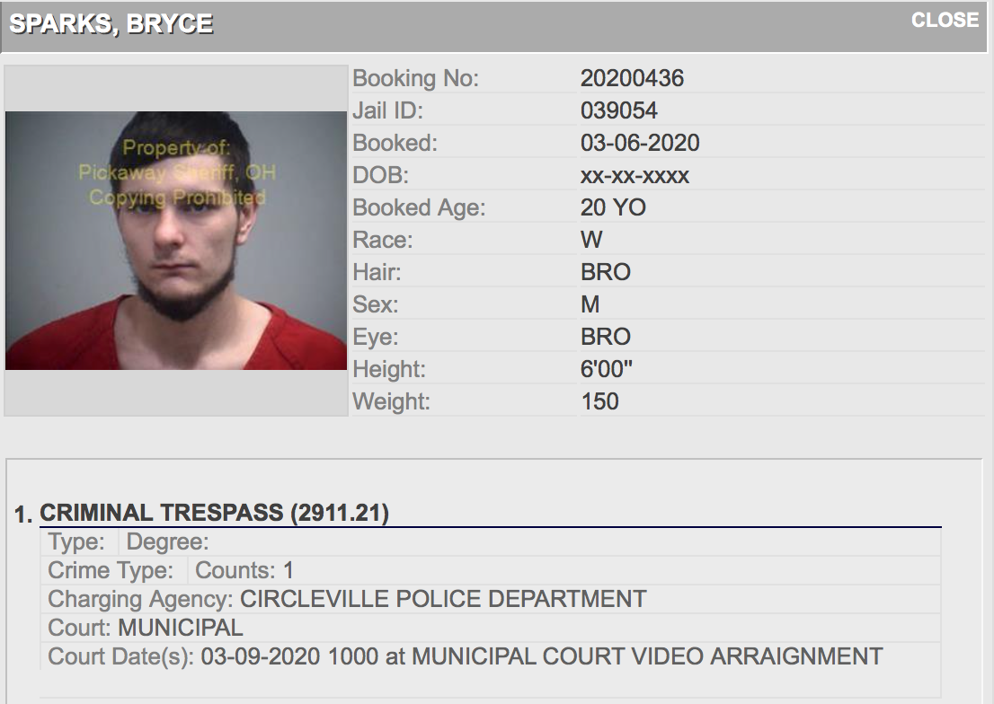 • Bryce Sparks, 20 of Circleville, charged with Trespassing.