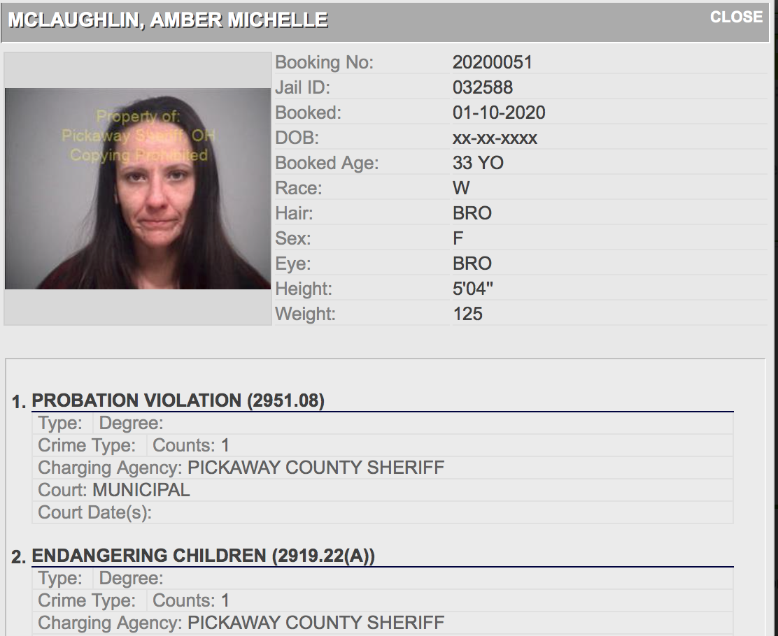 • Amber Mclaughlin 33 of Circleville, charged with Child Endangering, Possession of Drug Abuse Instruments, Possession of Drug Paraphernalia, Permitting Drug Abuse and a warrant for Probation Violation.