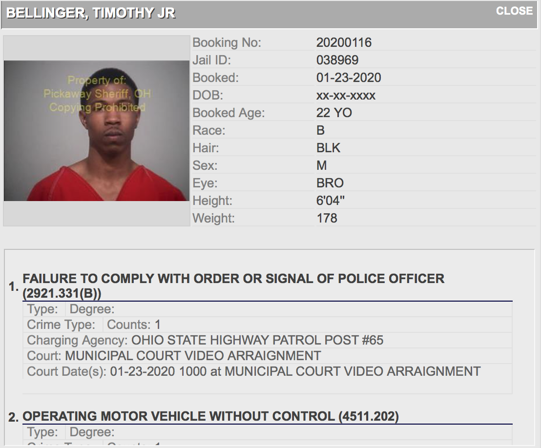 Timothy Bellinger Jr. was arrested on charges of failure to comply to a police officer, Operating a vehicle without control, speeding, hit skip run, and is currently housed in Pickaway Sheriffs office.