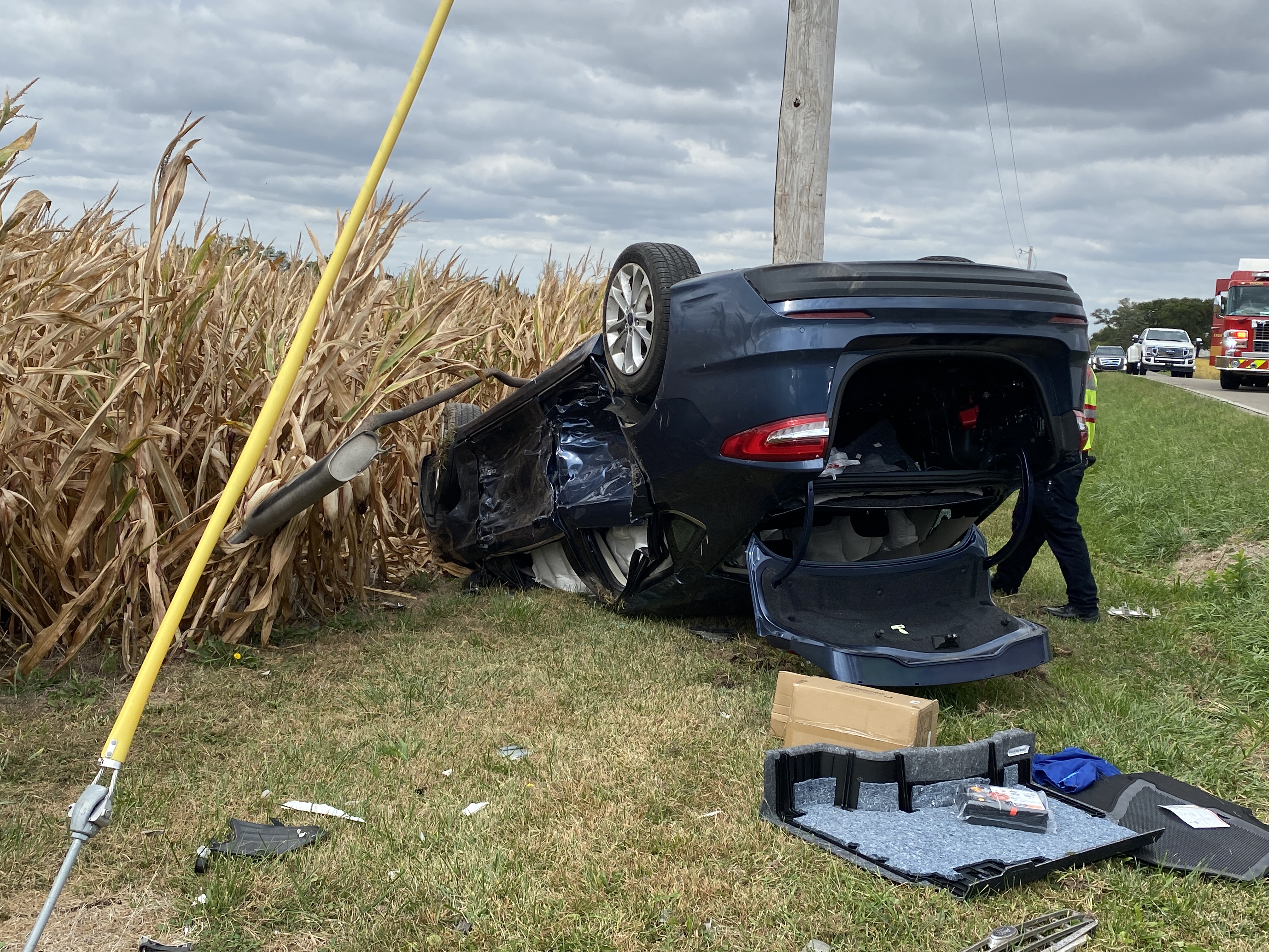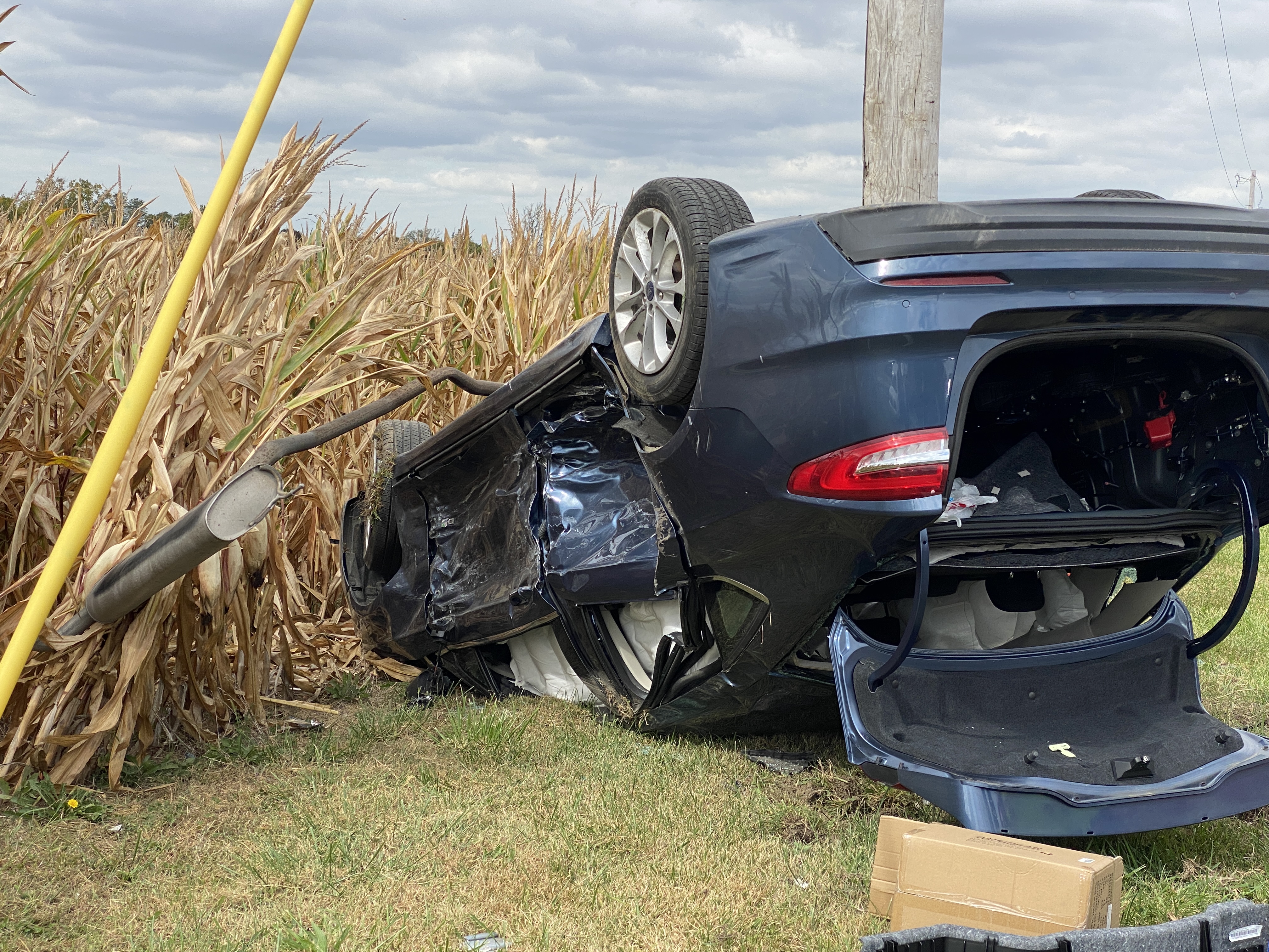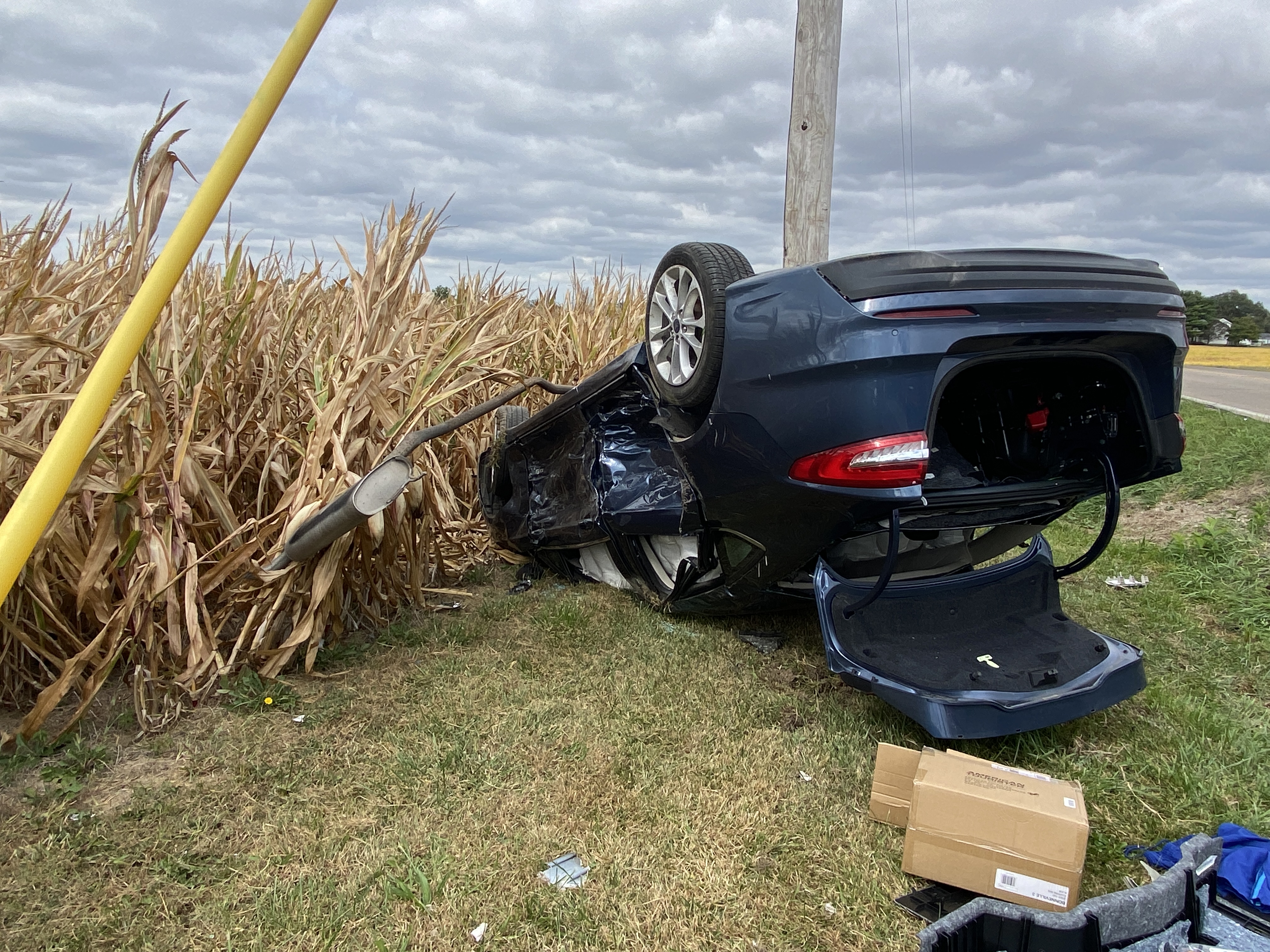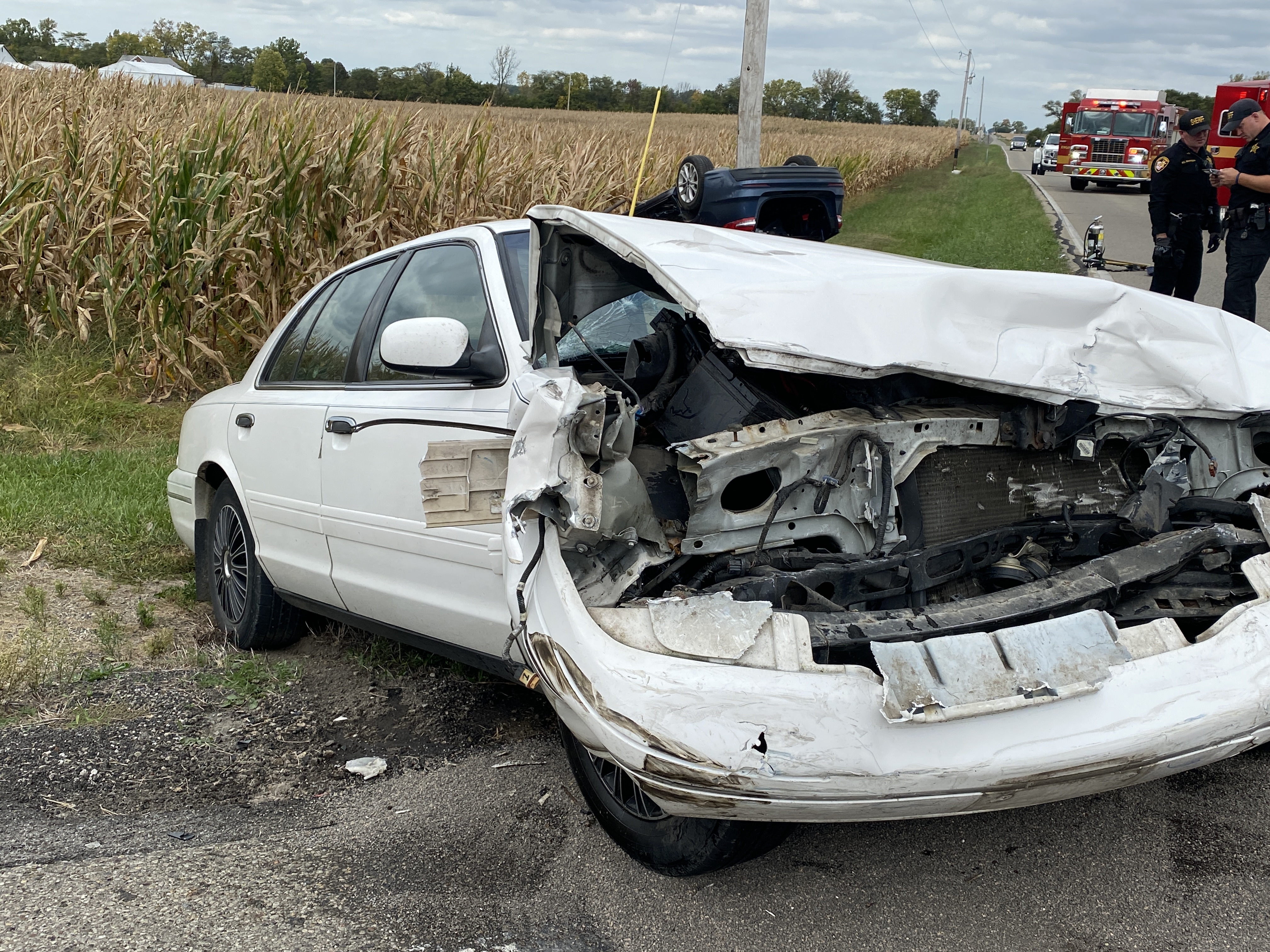According to Pickaway Sheriff department on scene the White Crown Victoria driven by a man from Pickaway County was driving westbound on Bell Station road when it failed to yield to the stop sign at the intersection of Walnut creek crashing into the Blue Ford Focus. The Focus overturned into a farm field and came to rest on its top.