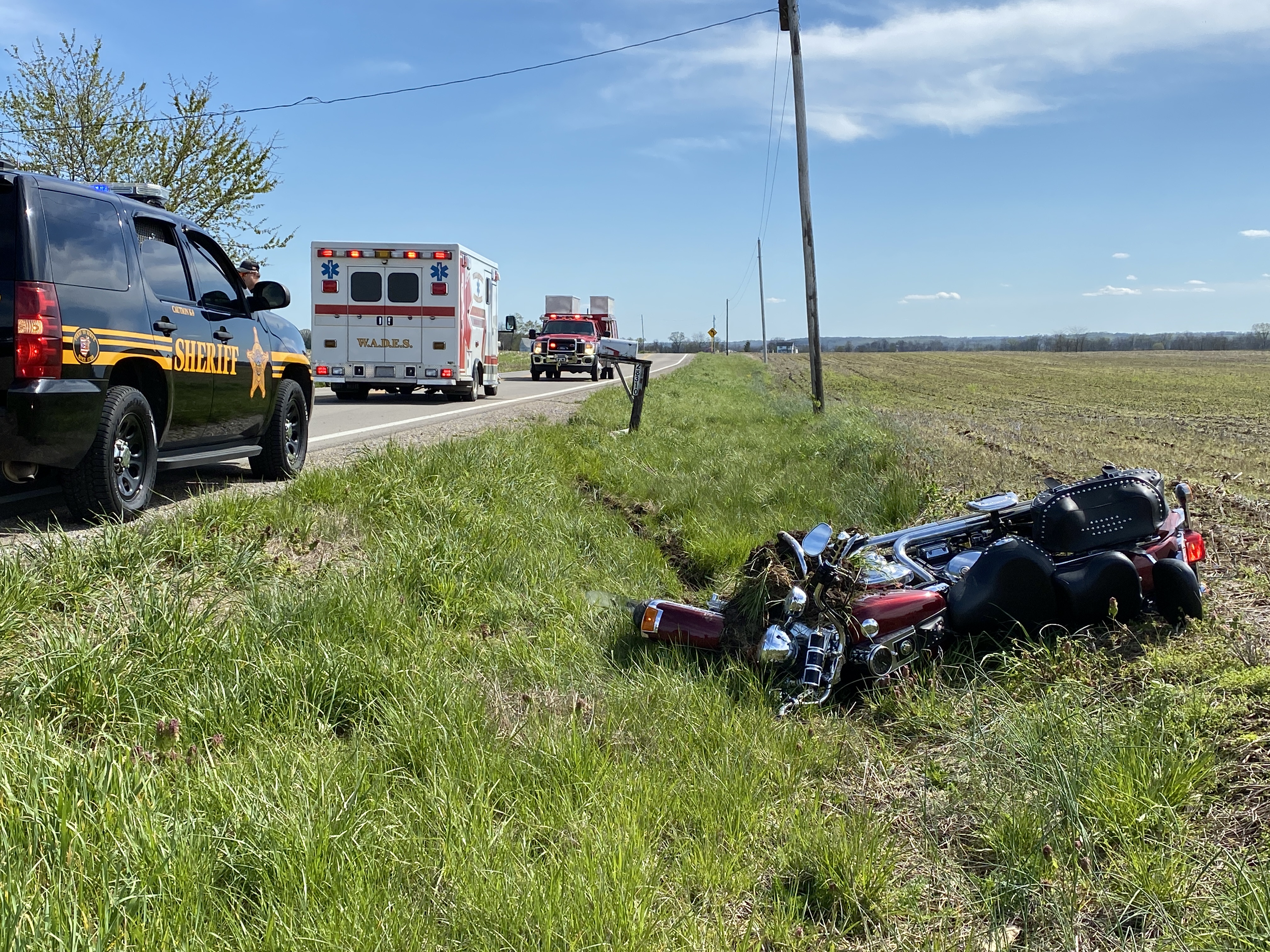 According to Pickaway Sheriff on scene a group of three motorcycles was heading Northbound on 104 around 3:05 pm when the lead motorcycle had a mechanical issue and lost control, this caused the bike to fishtail and make contact with a second motorcycle causing it to lose control also. Both motorcycles involved had a driver and a passenger. The passenger of the front motorcycle a woman was ejected off the back of the motorcycle and sustained injuries, the driver rode the motorcycle into the ditch on the left hand side of the road only receiving minor injuries. The second bike in the accident slid off the right side of the road injuring both the driver and the passenger with minor injuries.