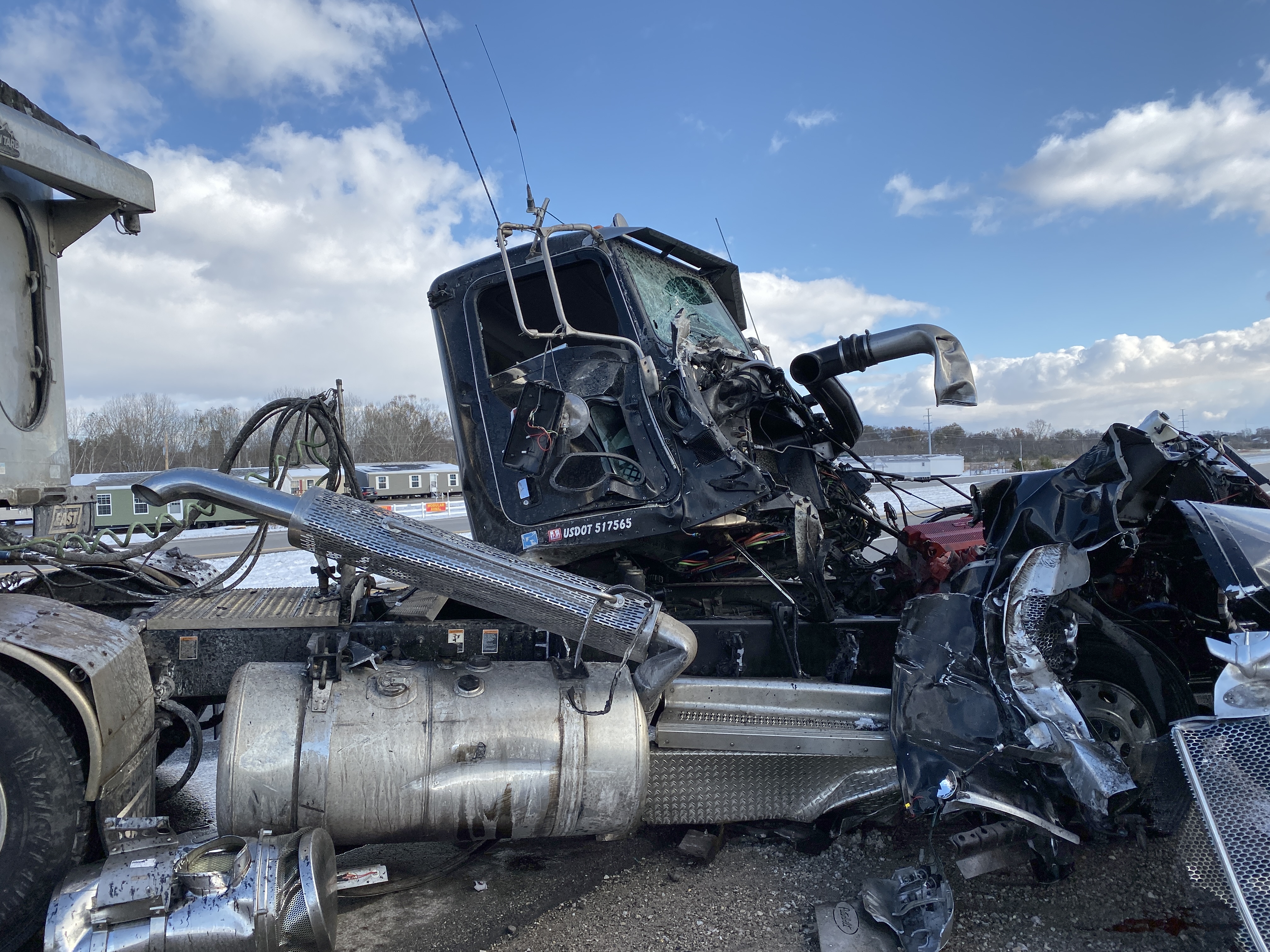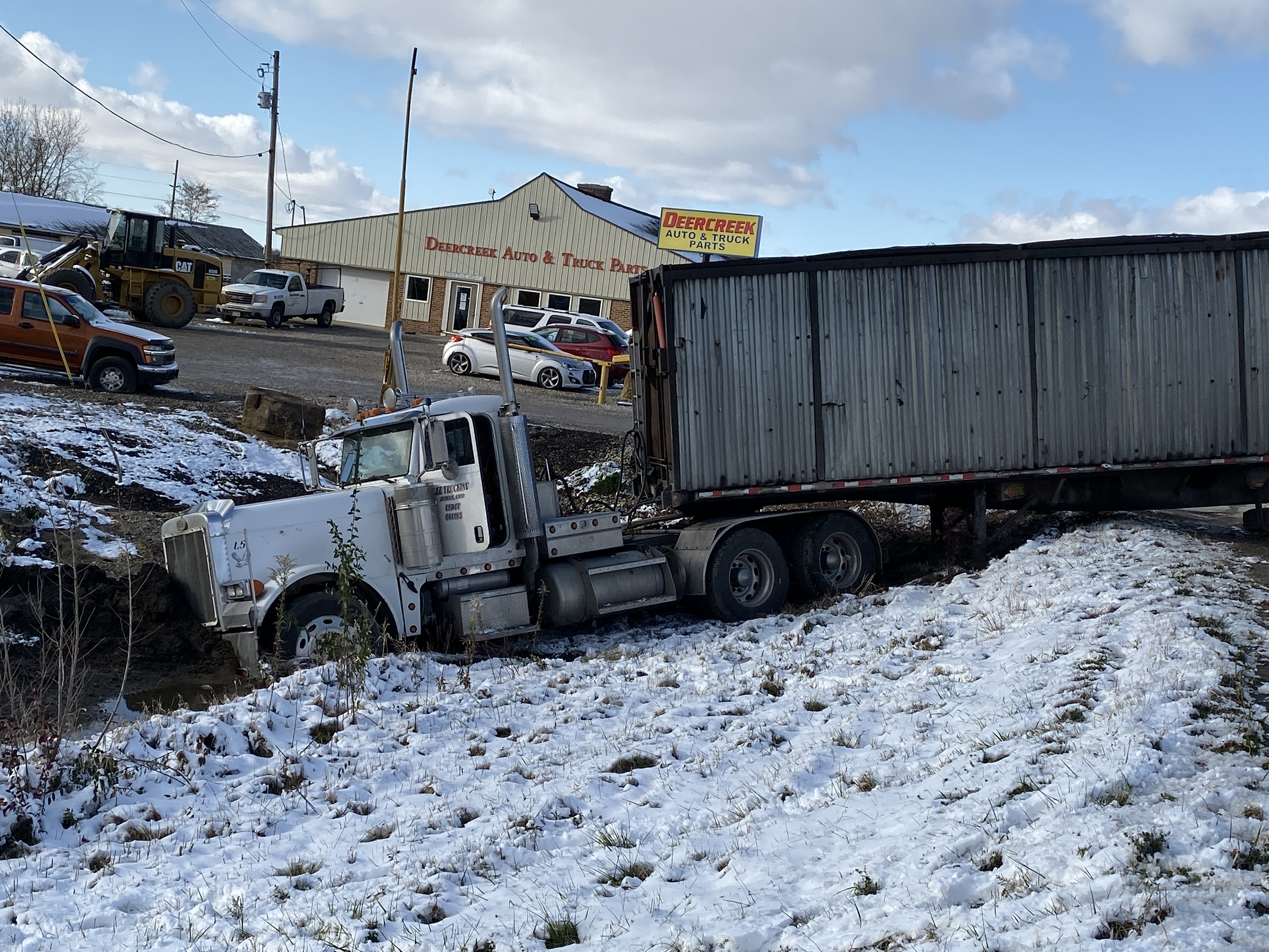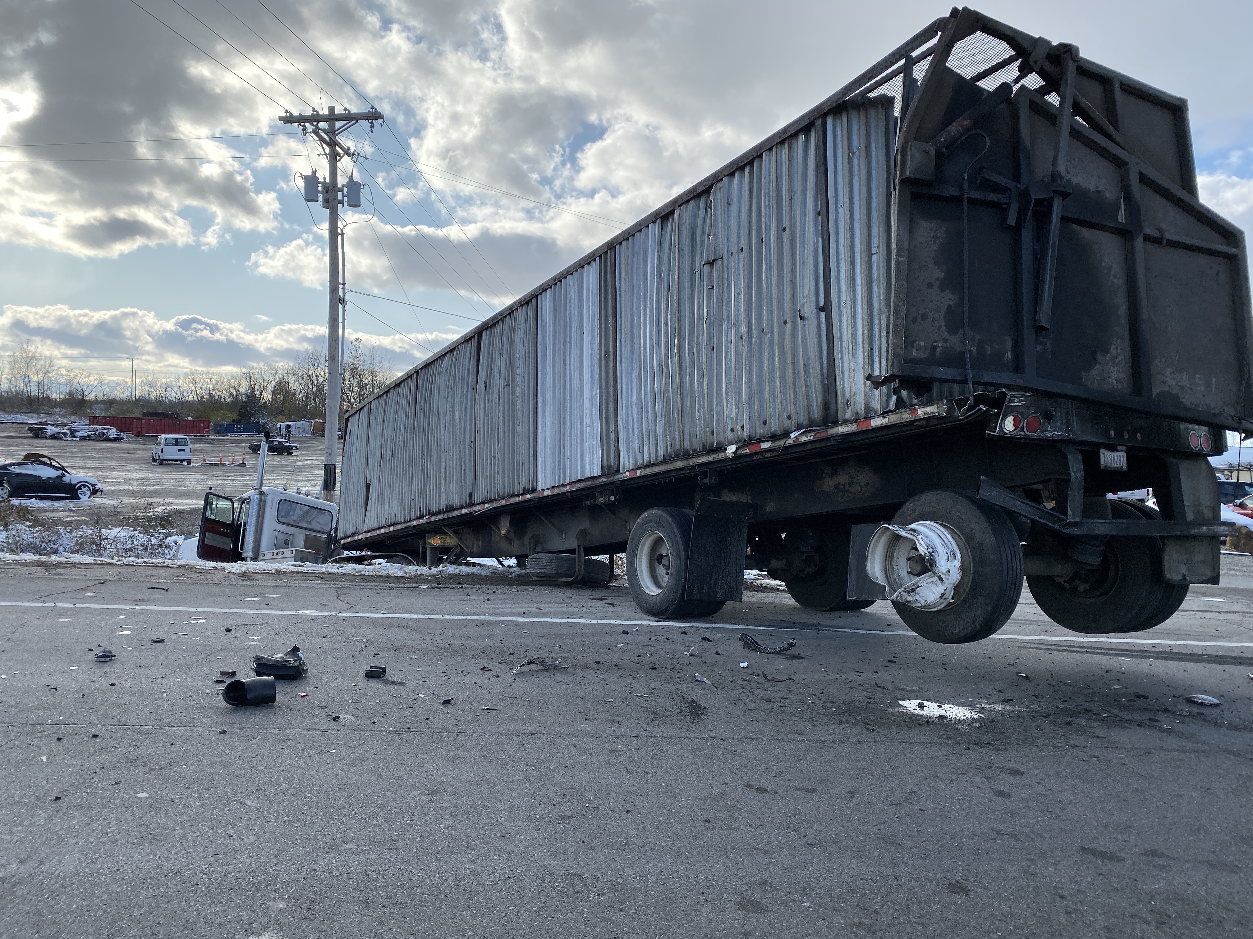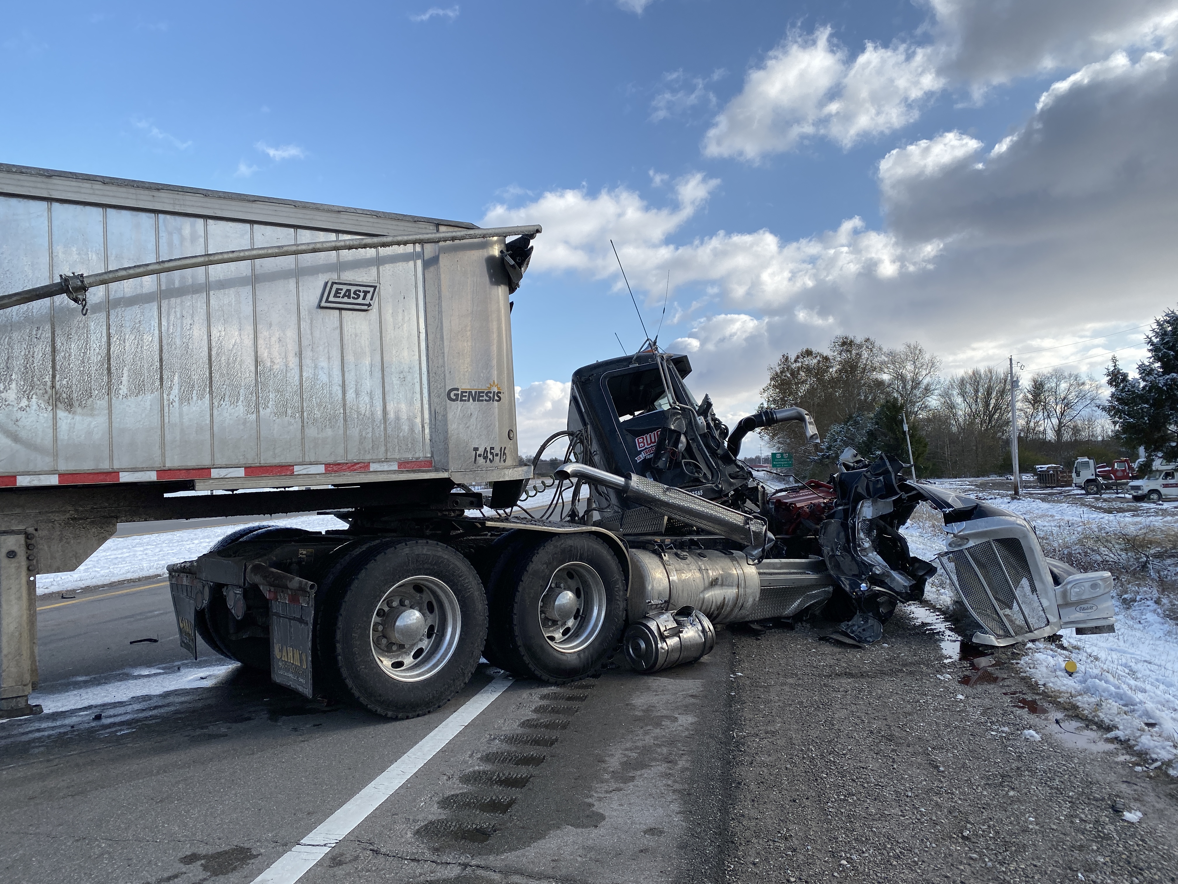 According to Pickaway County Sheriff The Lee Trucking Semi (White) was traveling southbound on US 23 in the right hand lane when it attempted to make a right hand turn into Deer Creek Auto salvage. The second Semi BWC Trucking (Black) was also heading southbound on US 23 in the right hand lane failed to maintain assured clear distance and rear ended the front semi. The front semi (white) was pushed into the 10 foot ditch on the right side of the road where it came to rest in about 2 feet of mud and water. The rear semi (black) hit the left rear of the trailer that the front semi was hauling, the trailer pierced the cab and knocked it loose of the main body of the truck. The second semi came to rest in the middle of US 23 blocking traffic.