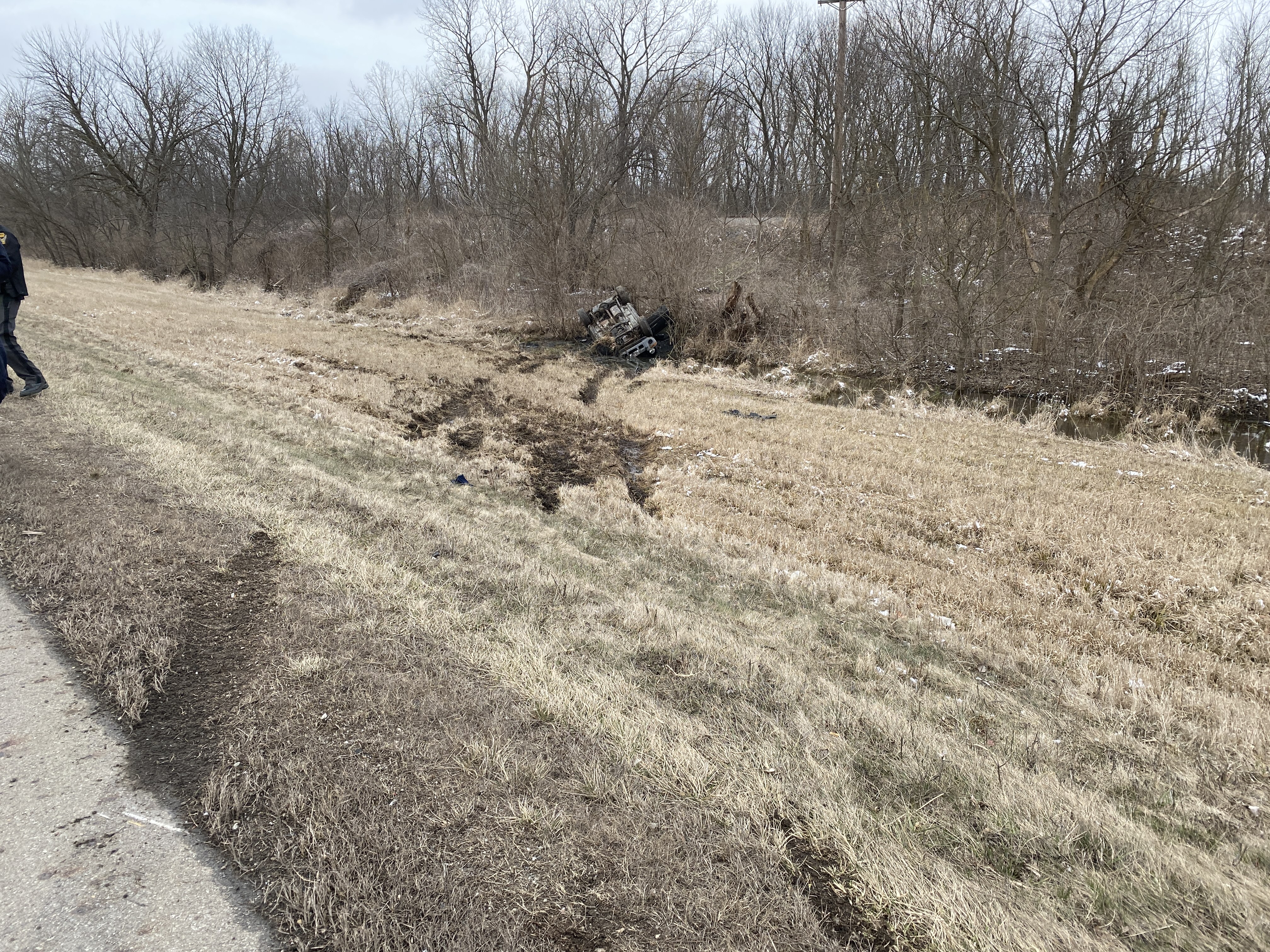 According to the Pickaway Deputy on scene a white van was heading Northbound on US-23 when the Black Jeep Liberty also going Northbound on US-23 clipped the rear end of the van trying to pass. That collision caused the Liberty driver to lose control and leave the roadway at a high rate of speed. The angle of the jeep caused the vehicle to roll over several times before coming to rest on its top in a water filled ditch at the edge of the tree line. The driver was able to escape the vehicle from the drivers door.