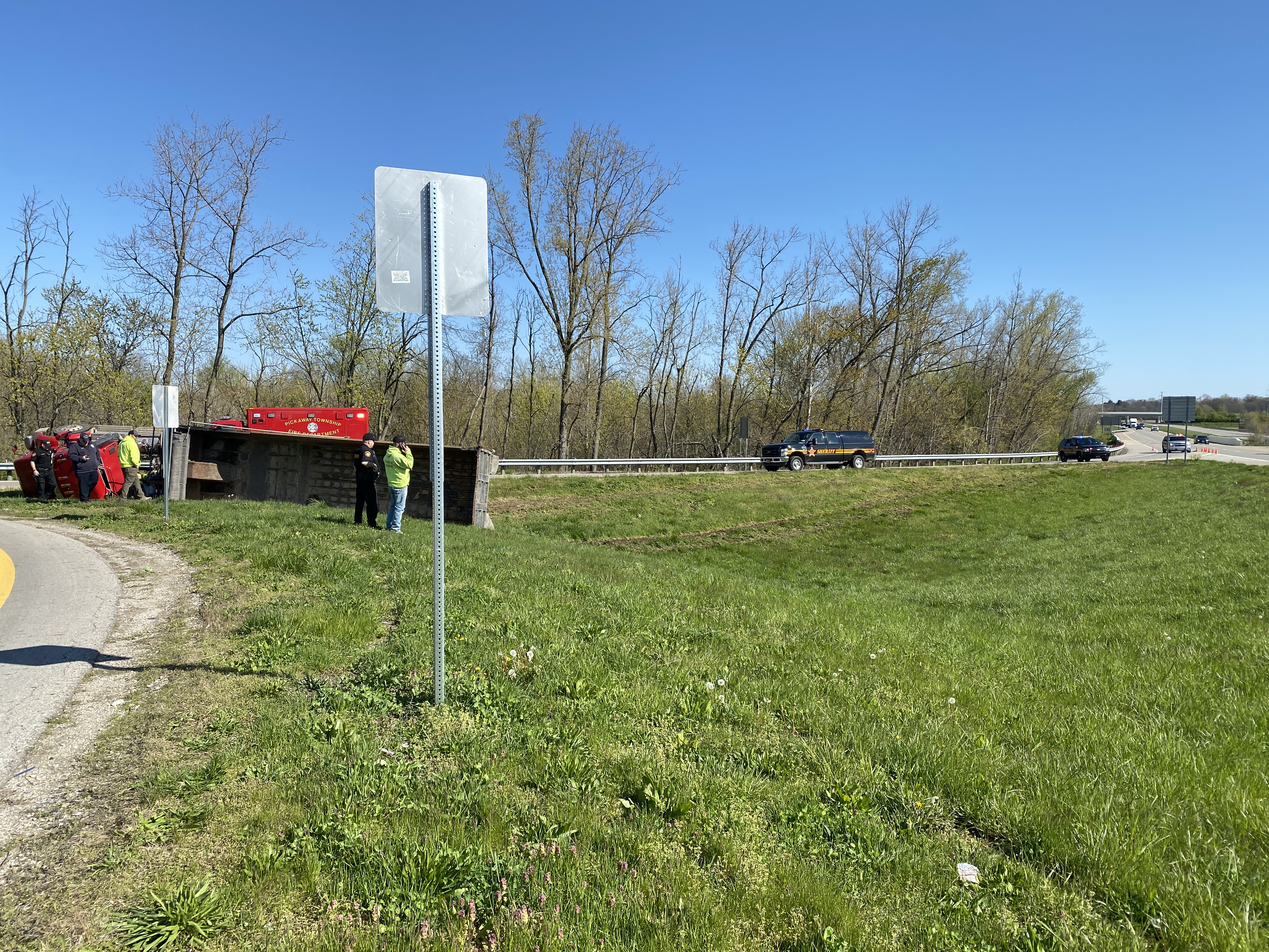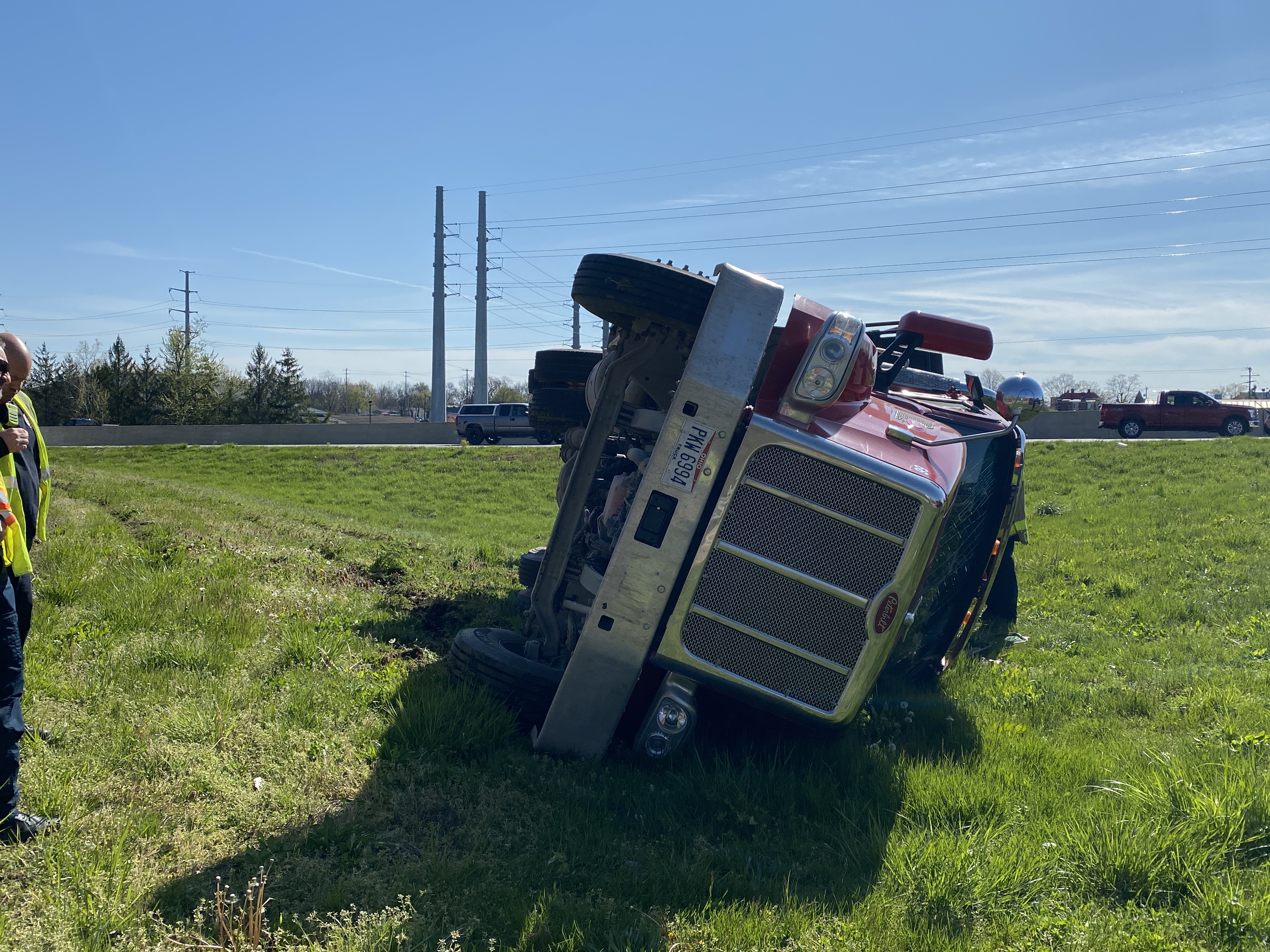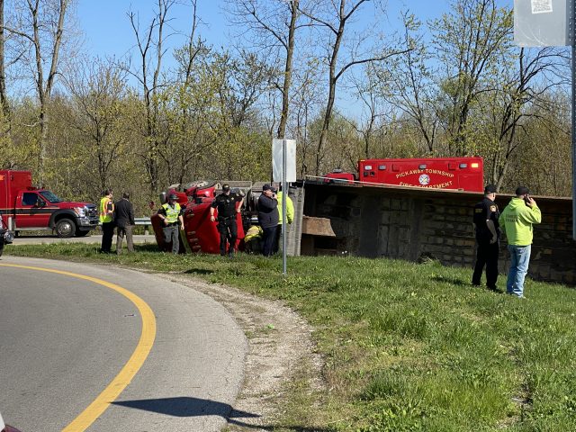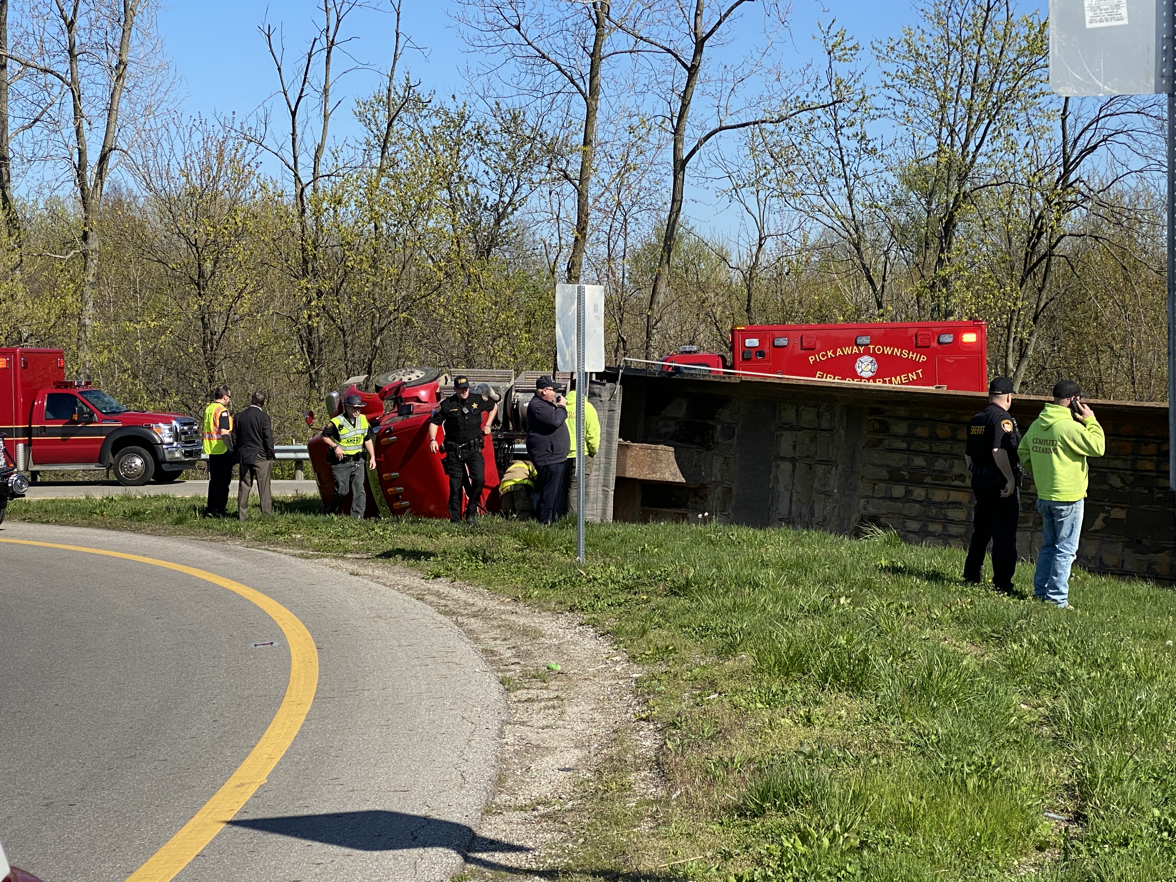 PICKAWAY – Around 8:51 am on April, 20, 2020 Pickaway Sheriffs office received a report of a dump truck that had lost control and flipped on its side at the US-23 south and Main Street exit.