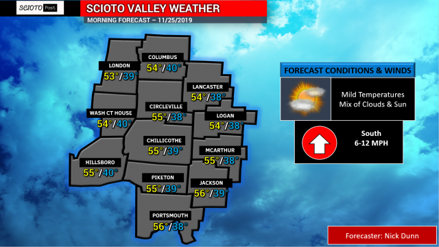 OHIO — We will start off the shortened work and school week with very comfortable conditions. A breeze form the south will bring some milder air into the Scioto Valley today. This will allow for afternoon highs in the middle 50’s with a mix of sun and clouds. Winds will be between 6 and 12 MPH, so it will be nice to get out and enjoy the nice weather!