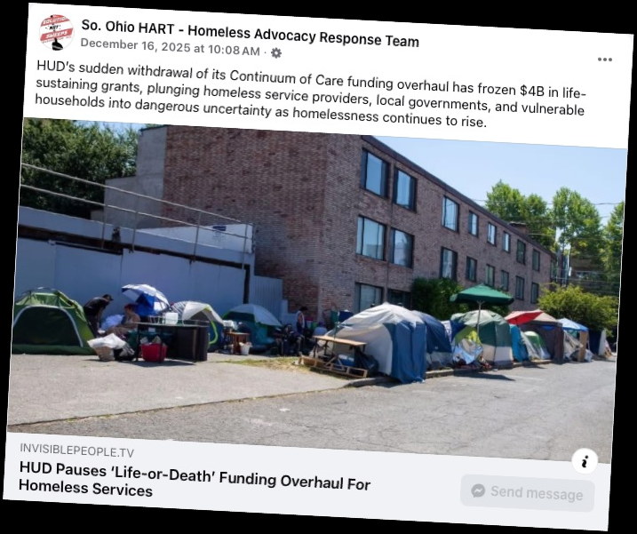 Learn more on the Facebook page of So. Ohio HART, especially December 16th shares of posts by InvisiblePeople.TV: “What’s At Stake With Trump’s CoC Funding Cuts” and “HUD Pauses ‘Life-or-Death’ Funding Overhaul For Homeless Services.”