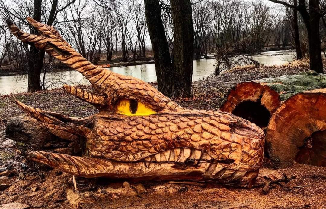He said in a recent social media post “I’d like for everyone to formally meet my most recent chainsaw creation Rot, the Wetland Trail Dragon. His name and form are both due to the immense amount of rot in the log and root base. Still a lot of rot to remove on “Rot” but at least the majority of the details are in place. See my previous post for a complete video of the carving process!!”